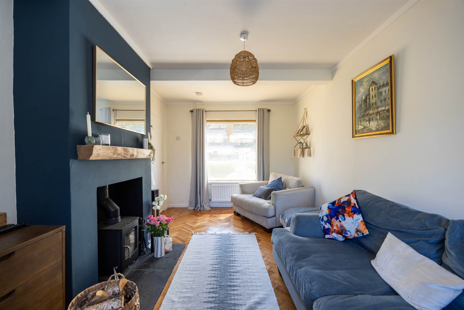 Feature multi fuel stove, oak over mantle, slate hearth, period varnished parquet flooring, cornice ceiling.