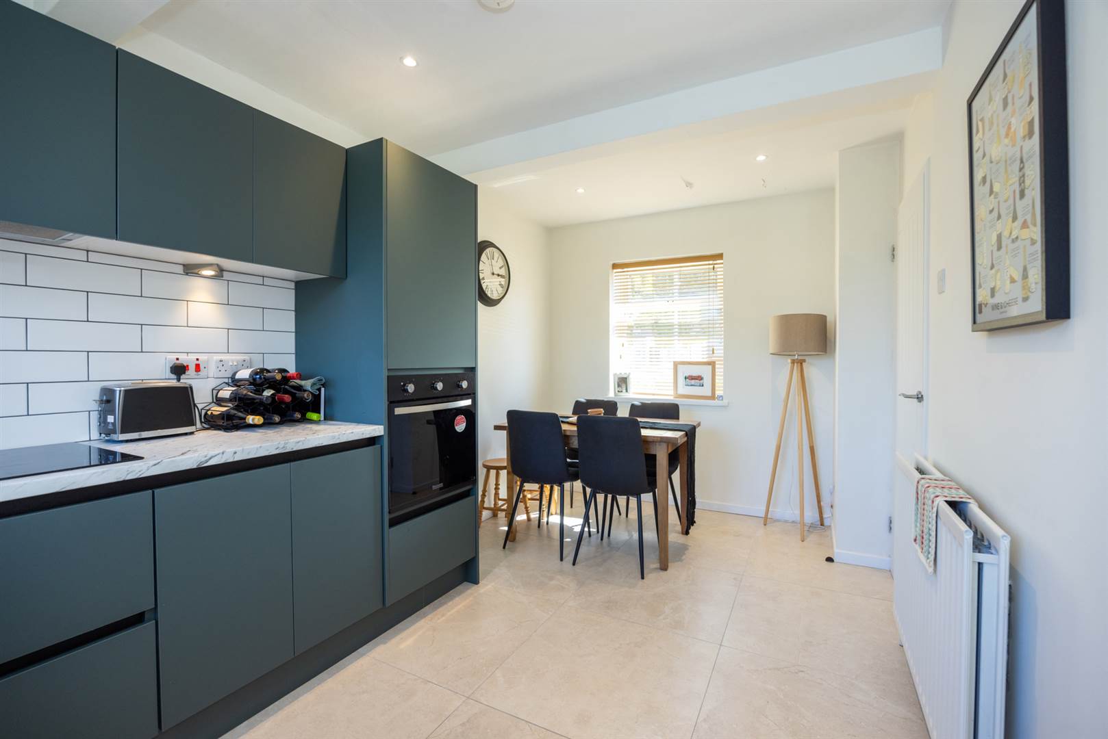 Recently installed contemporary kitchen with handleless cupboards and integrated appliances opening into a dining area