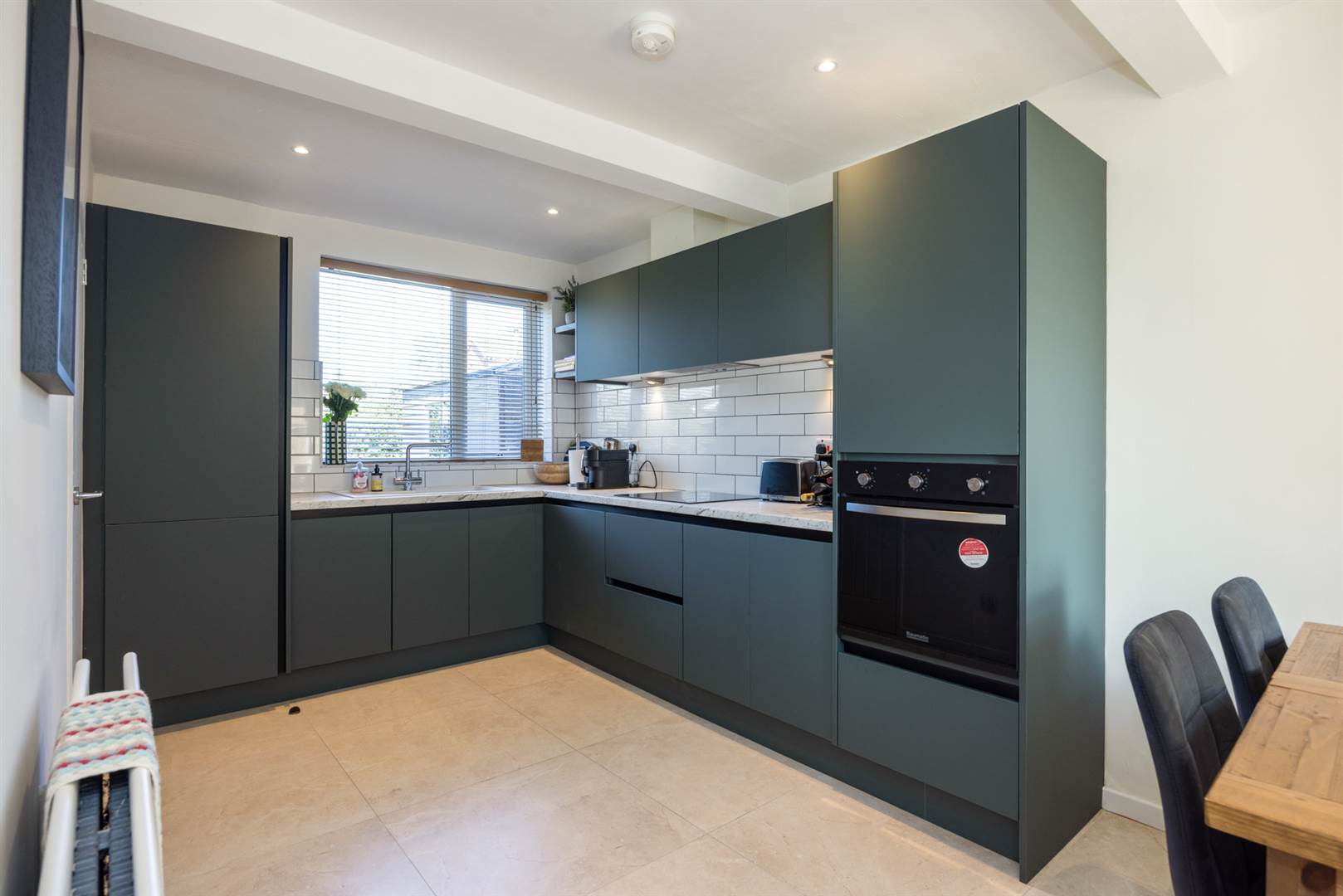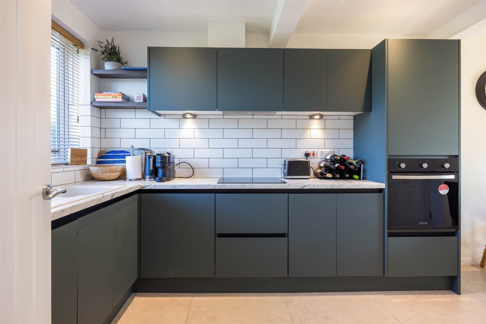 Extensive range of high and low level handleless units, under unit lighting, marble effect worktops, four ring ceramic hob with extractor above, integrated oven, fridge freezer, dishwasher, single drainer sink unit and mixer tap, part tiled walls, ceramic tiled floor, low voltage lighting.