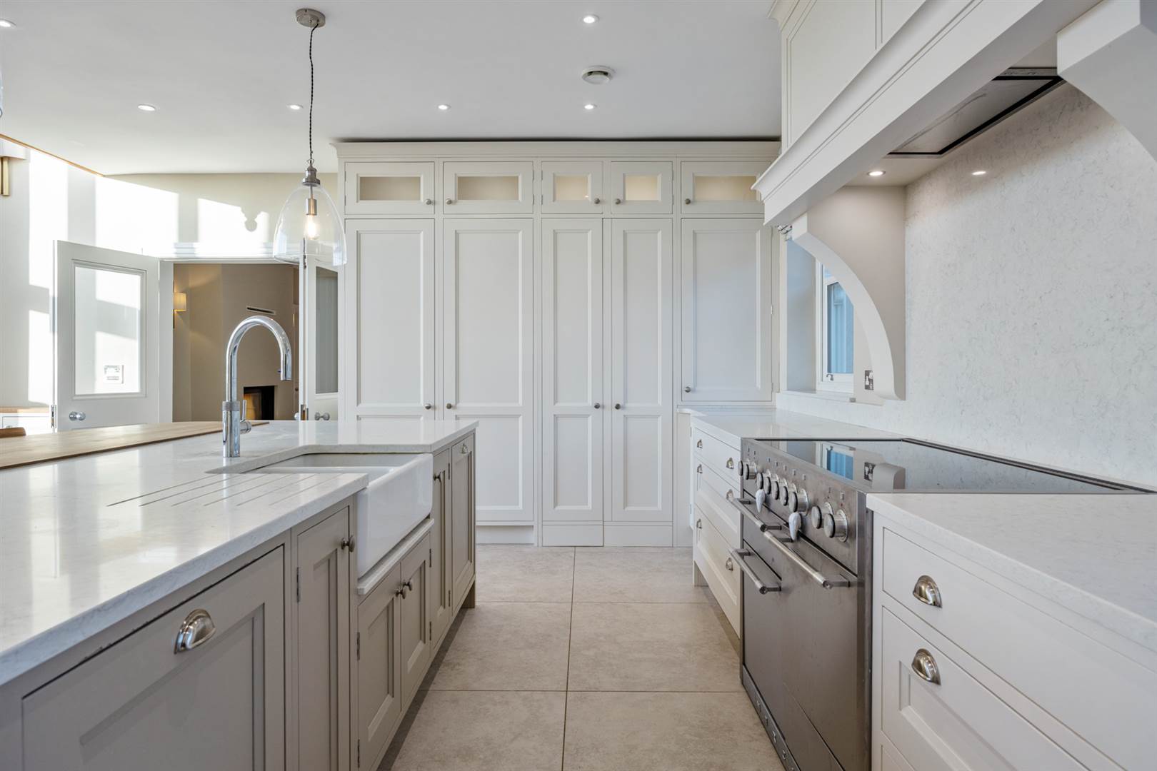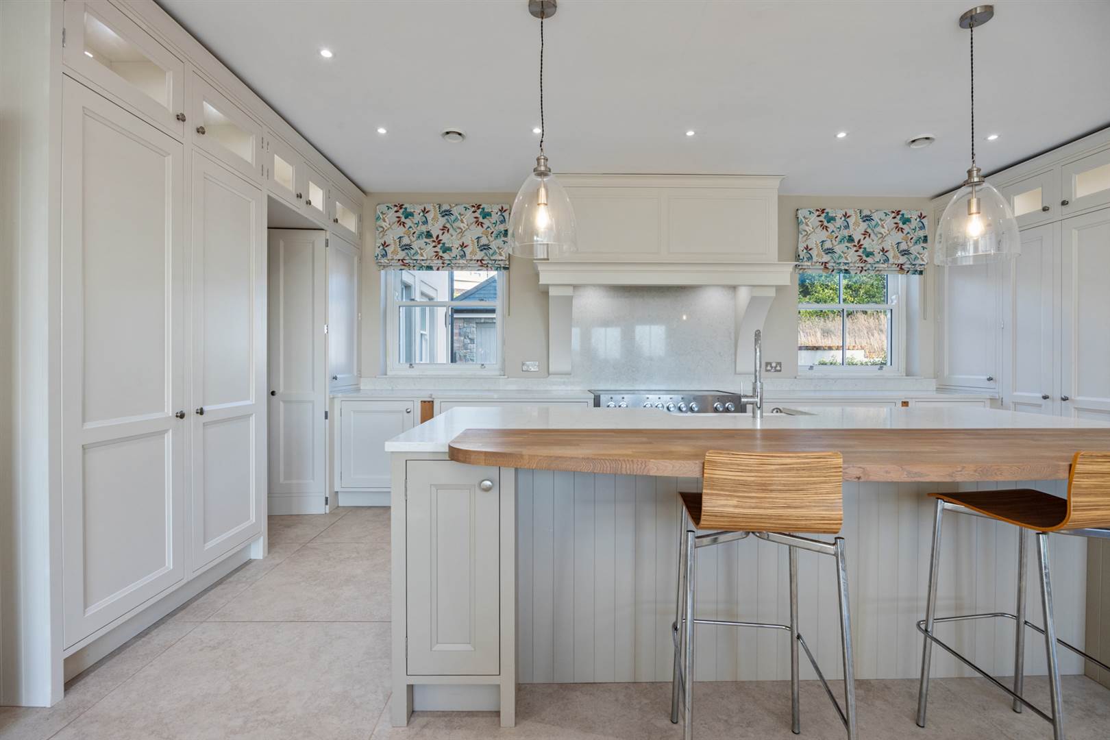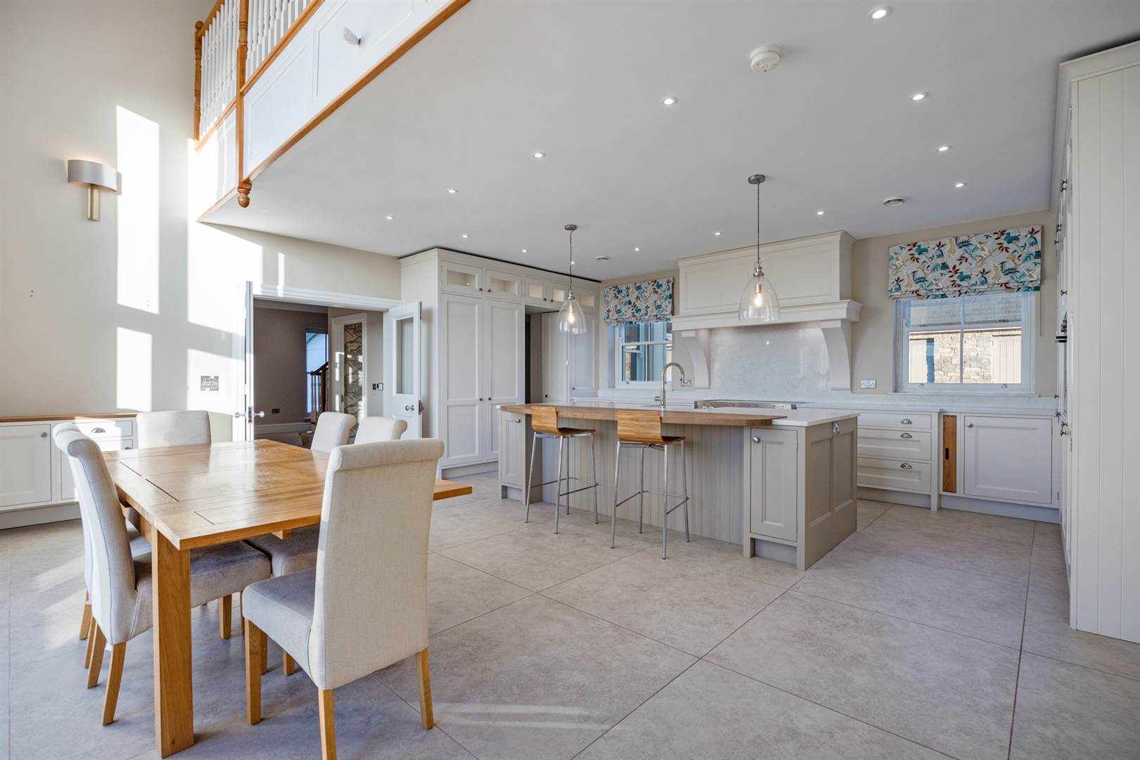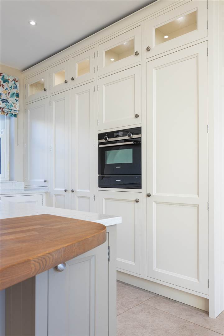 Hand crafted kitchen with an array of integrated appliances open to a glazed dining area plus a concealed utility room, boot room and wet room