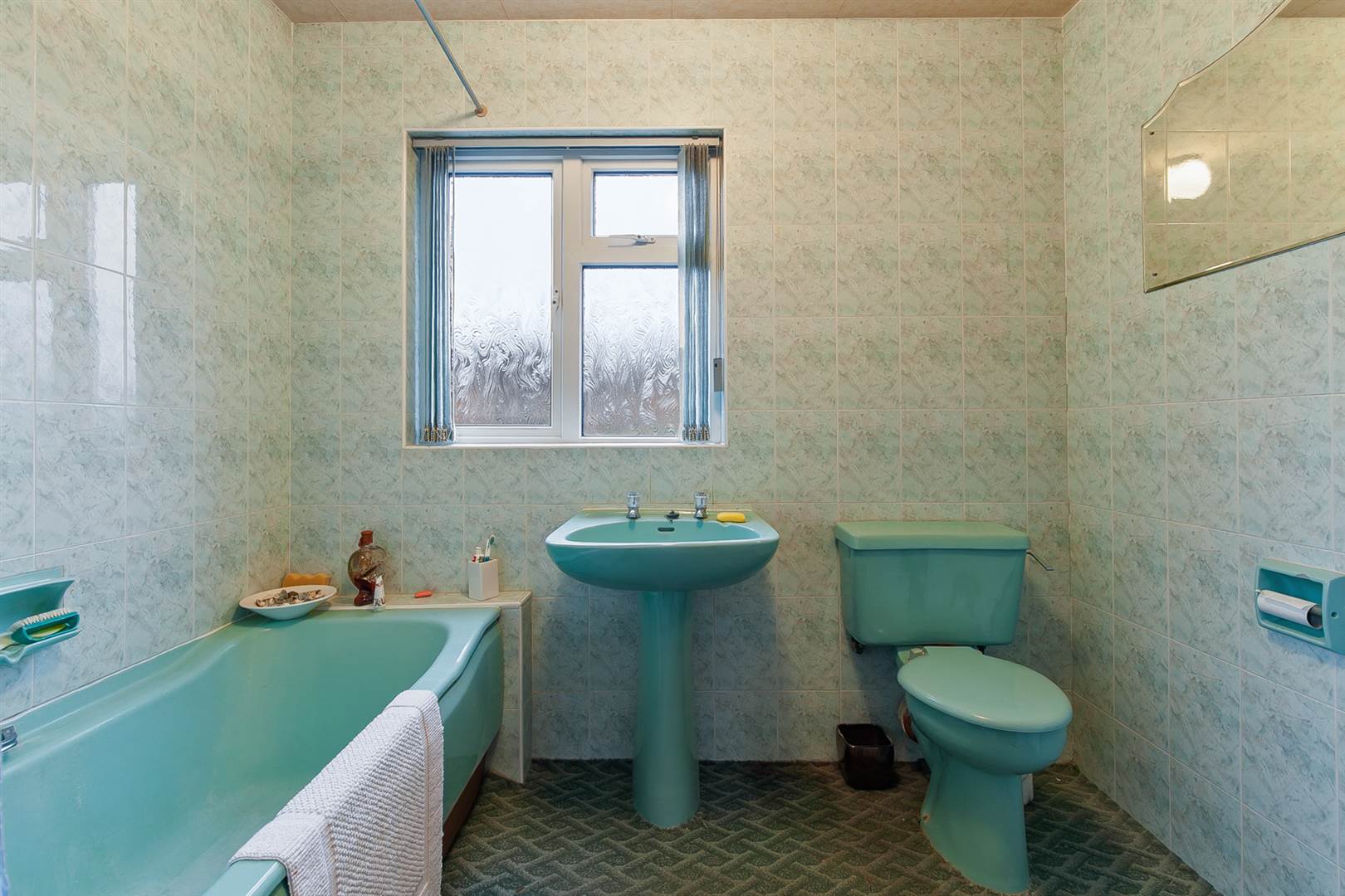 Coloured suite comprising panelled bath, Redring instant heat shower over, pedestal wash hand basin, low flush wc, fully tiled, medicine cabinet.