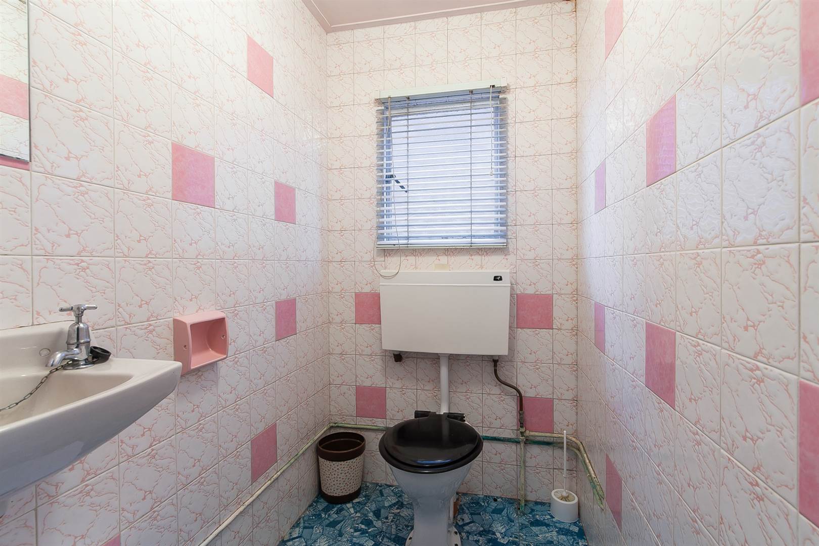Low flush wc, wash hand basin, fully tiled.