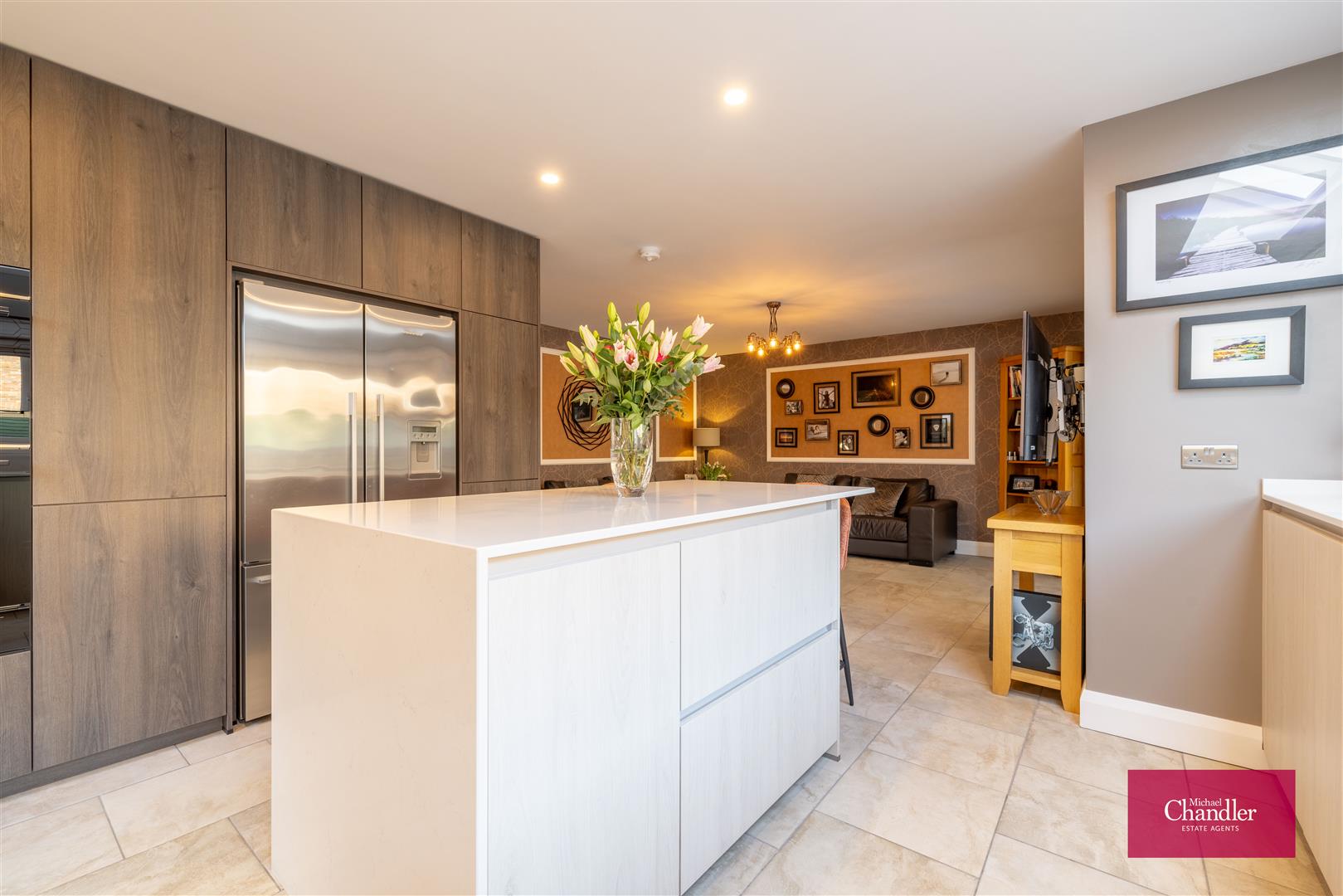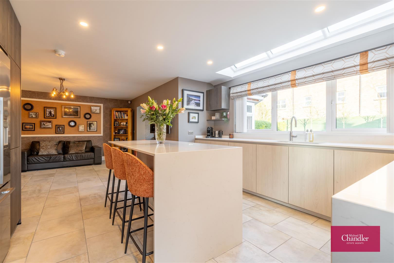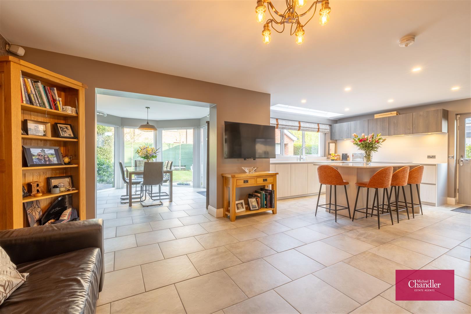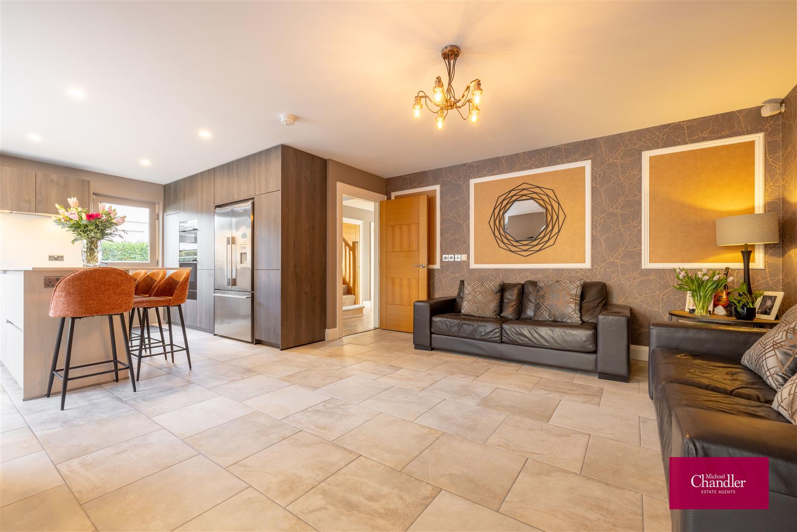 As you enter, you are greeted by a welcoming entrance hall that features convenient storage and a luxurious guest WC. The ground floor boasts three generous reception rooms, including a delightful family room with a solid wood floor and a cosy gas fire, perfect for those chilly evenings. The highlight of the home is the impressive open-plan kitchen, living, and dining area, which seamlessly connects to a bright conservatory, creating an ideal space for both entertaining and family gatherings. The bespoke kitchen, installed within the last year, features a large centre island, high-end integrated appliances and a side door for easy access.