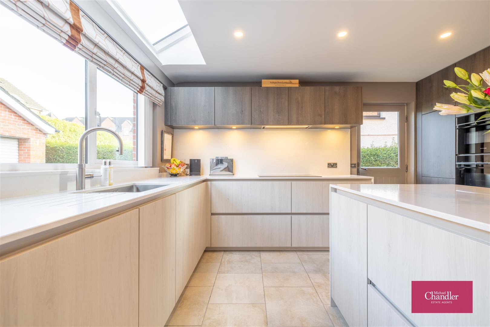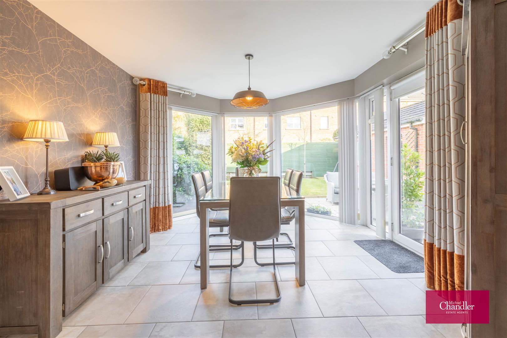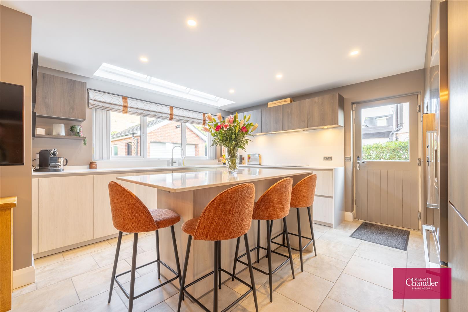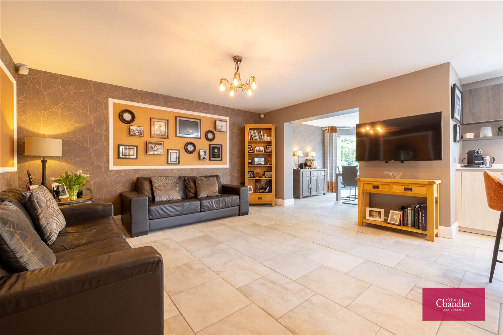As you enter, you are greeted by a welcoming entrance hall that features convenient storage and a luxurious guest WC. The ground floor boasts three generous reception rooms, including a delightful family room with a solid wood floor and a cosy gas fire, perfect for those chilly evenings. The highlight of the home is the impressive open-plan kitchen, living, and dining area, which seamlessly connects to a bright conservatory, creating an ideal space for both entertaining and family gatherings. The bespoke kitchen, installed within the last year, features a large centre island, high-end integrated appliances and a side door for easy access.