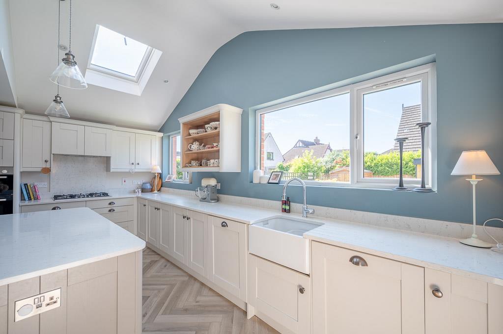 Hand painted Shaker style bespoke fitted kitchen with quartz work surface, upstand and splashback to five ring integrated stainless steel Bosch gas hob, extractor hood above, concealed low voltage lighting, built-in display shelving cabinet, ceramic sink unit with chrome mixer taps, integrated dishwasher, pull-out bin and recycling, concealed cabinet plumbed for washing machine with space for dryer above, integrated larder fridge freezer, built-in pantry cabinets, island unit with quartz work surface, additional cabinetry including integrated low level fridge freezer and built-in casual dining/breakfast bar, oak chevron laminate wooden flooring throughout, kitchen with vaulted ceiling, recessed LED spotlighting, mature outlook to rear garden, wall mounted radiators and uPVC double glazed access door to patio and garden, open to dining and living space and access to reception hall, kitchen with integrated high level double ovens and concealed microwave cabinet.