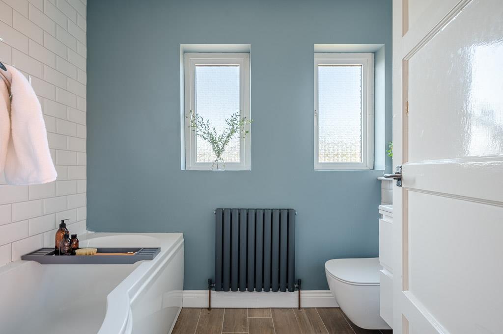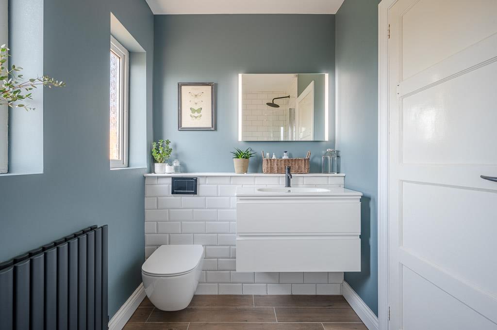 Modern white suite comprising close coupled WC, floating vanity unit with twin drawer units below, matt black mixer taps, part subway tiled recess, illuminated mirror, P-shaped panelled bath, matt black mixer taps, shaped shower screen, fully subway style tiling with built-in matt black thermostatically controlled shower unit, overhead drencher and shower attachment, oak style porcelain tiled flooring, recessed LED spotlighting, extractor fan.