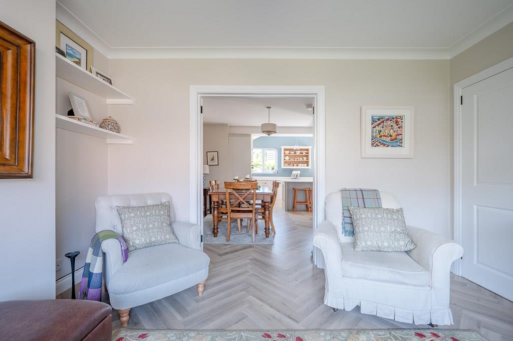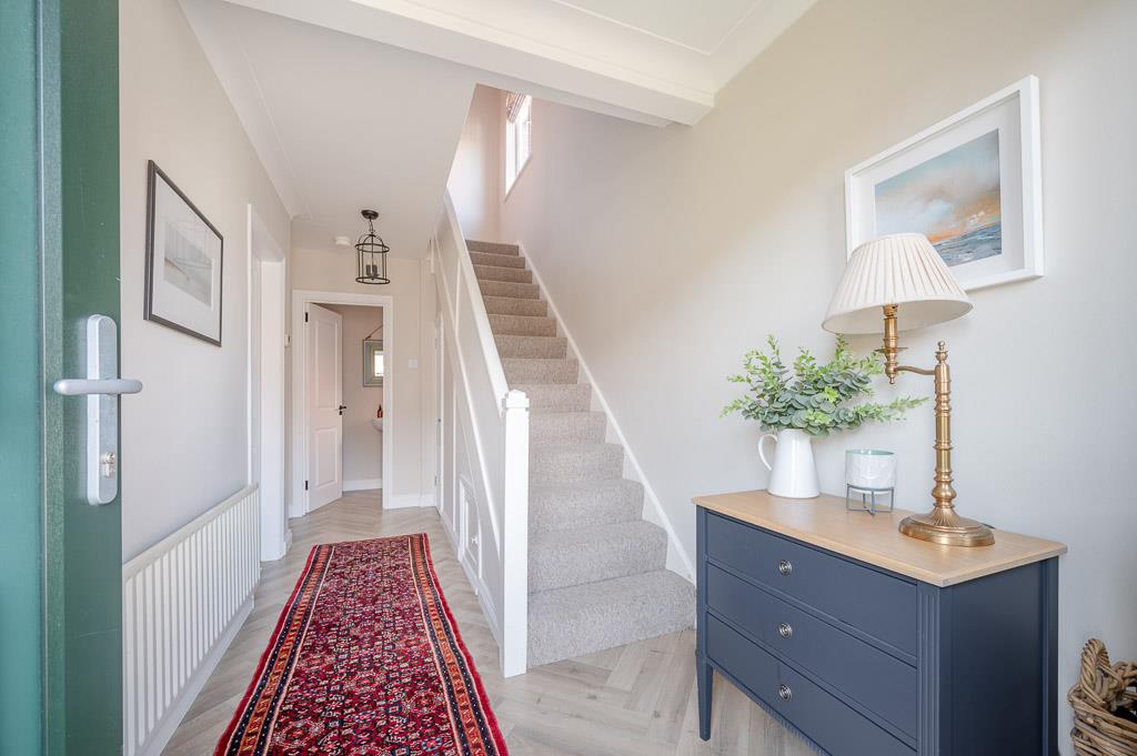 With oak laminate chevron flooring, cornice ceiling, excellent storage cupboard and cloaks under stairs.