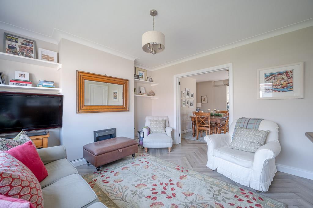 Oak chevron laminate flooring, cornice ceiling, mature outlook to front, built-in book and display shelving either side of chimney breast, hole in wall electric fire, double doors to L-shaped kitchen/dining/living space.