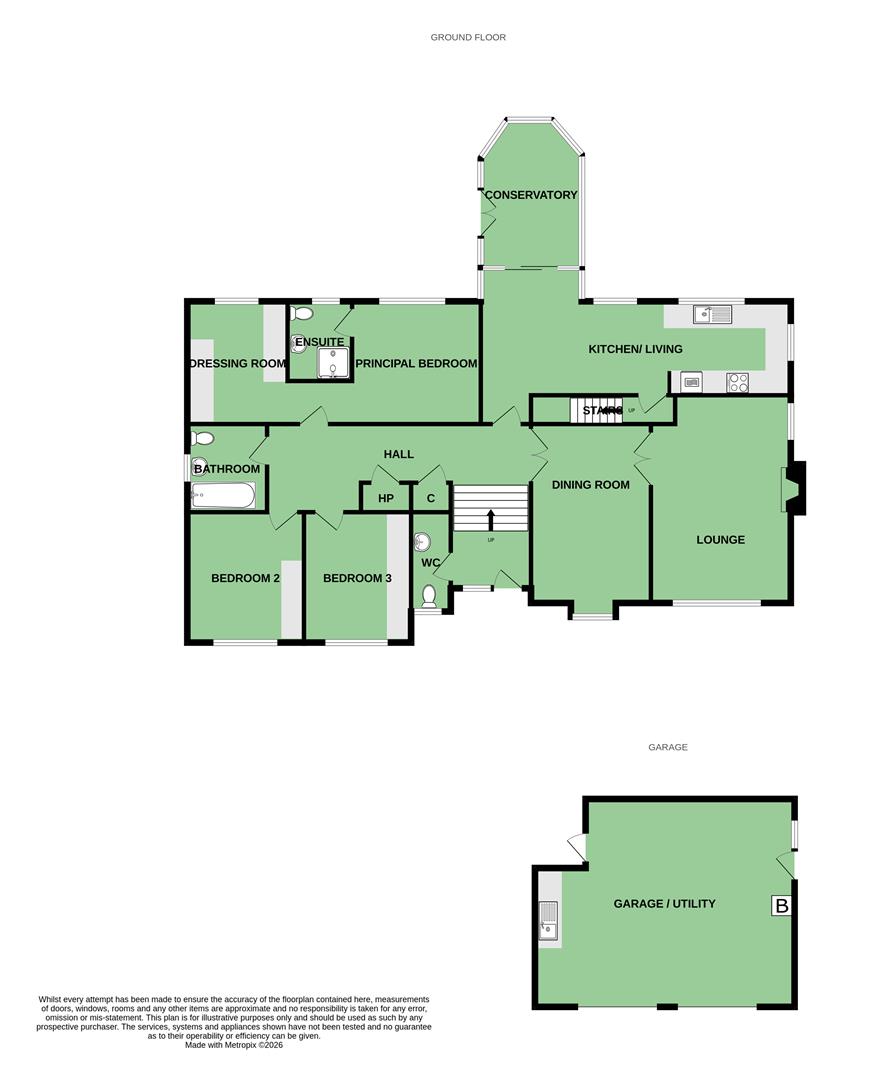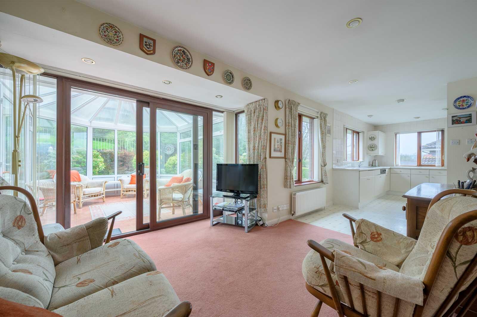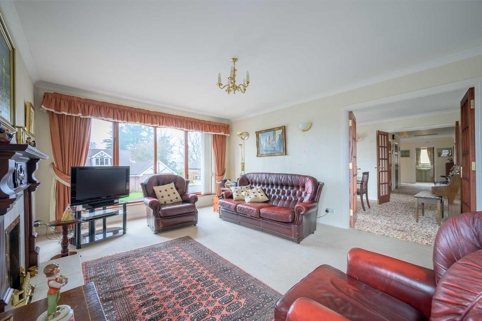 Inside, a welcoming reception hall introduces the bright and well-proportioned layout. The main lounge features a charming fireplace, dual-aspect windows and an elegant feel, connecting through double doors to a spacious dining room-ideal for entertaining. To the rear, a large open-plan kitchen/living/dining area provides a comfortable everyday living space, with picture windows framing views of the beautifully landscaped gardens. Sliding doors open to a substantial conservatory, offering a serene, all-year-round retreat flooded with natural light.