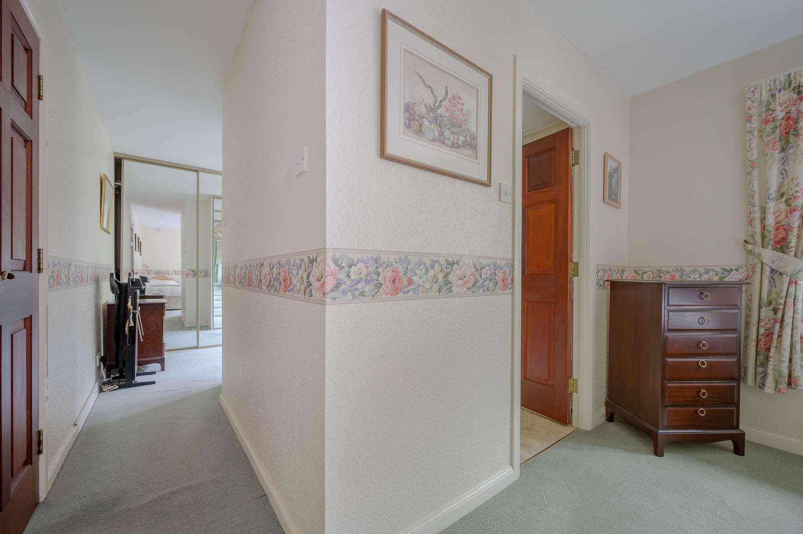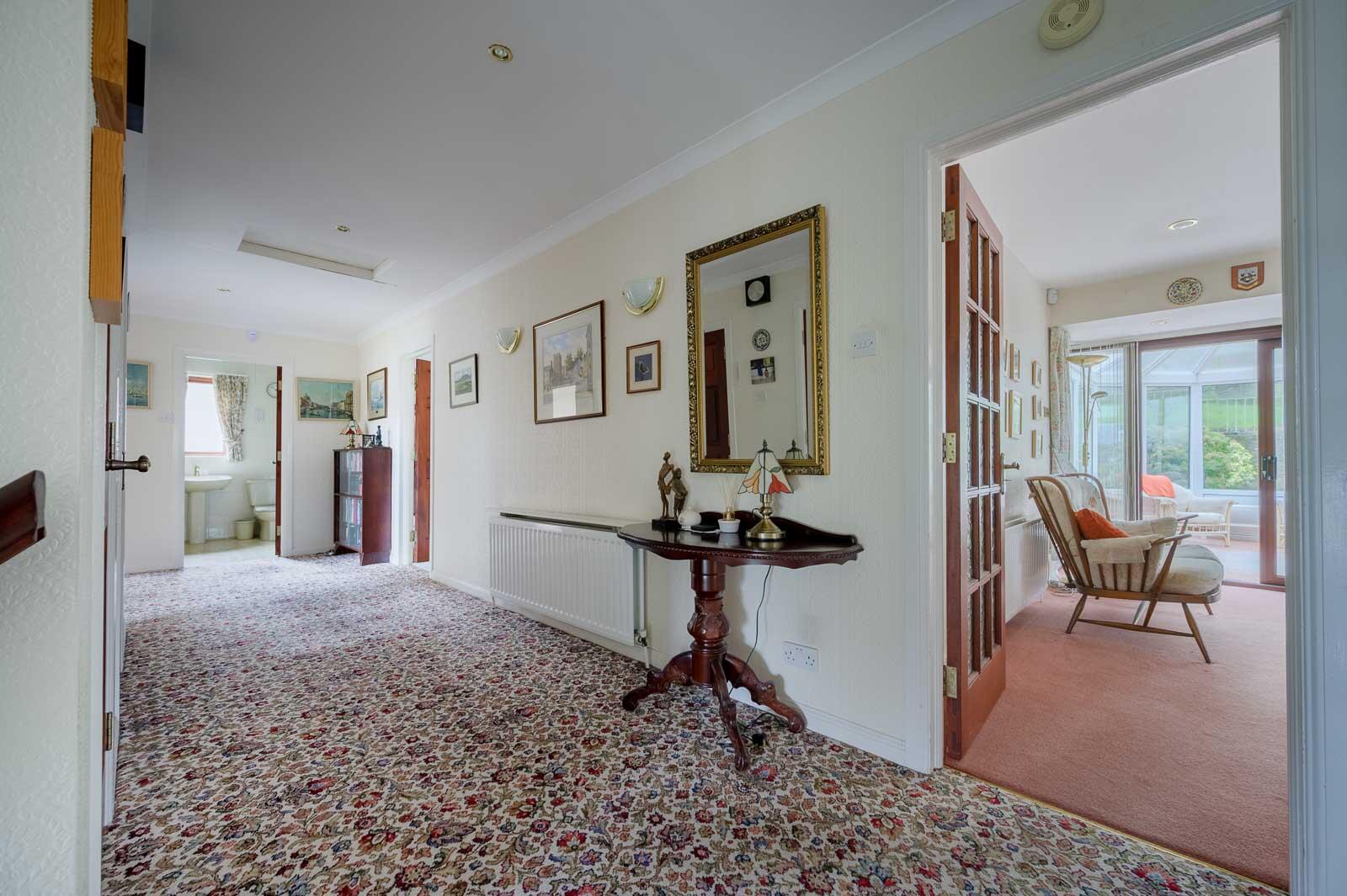 The kitchen provides ample storage and workspace, with excellent potential for modernisation or reconfiguration. Originally designed as four bedrooms, the home now benefits from a primary bedroom with ensuite and dressing room, alongside two further well-sized rooms, offering flexibility for families, guests or home working.