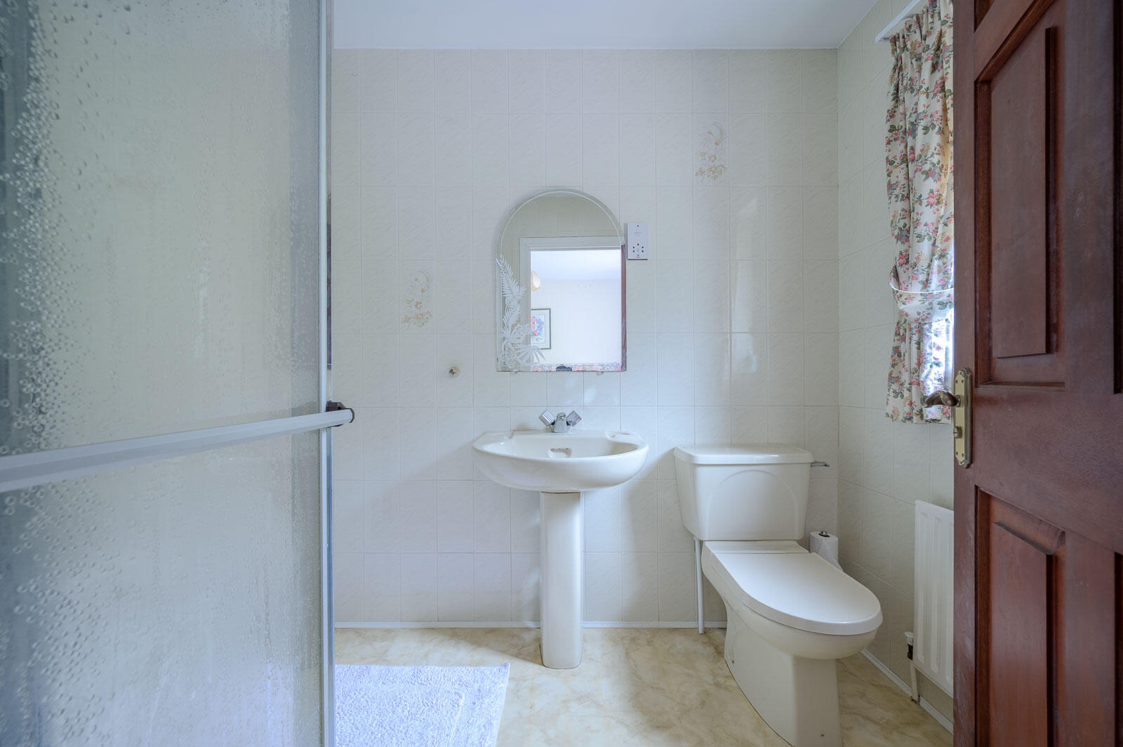 Light coloured suite comprising low flush WC, pedestal wash hand basin with mixer taps, intruder alarm controls, steps to reception hall.