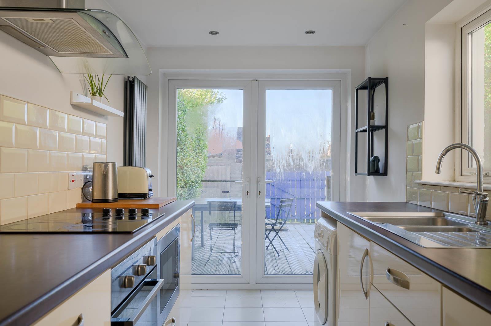 The modern kitchen is fitted with sleek high gloss cabinetry, integrated appliances, and ample worktop space. French doors open directly onto a private rear garden with a decked patio area, perfect for outdoor dining and enjoying the sunshine.