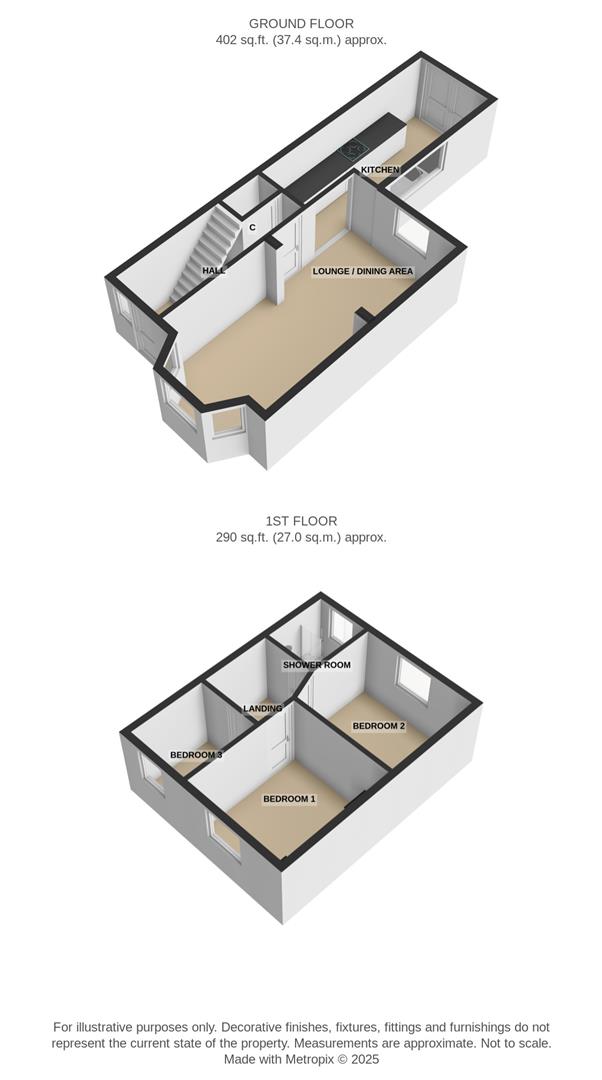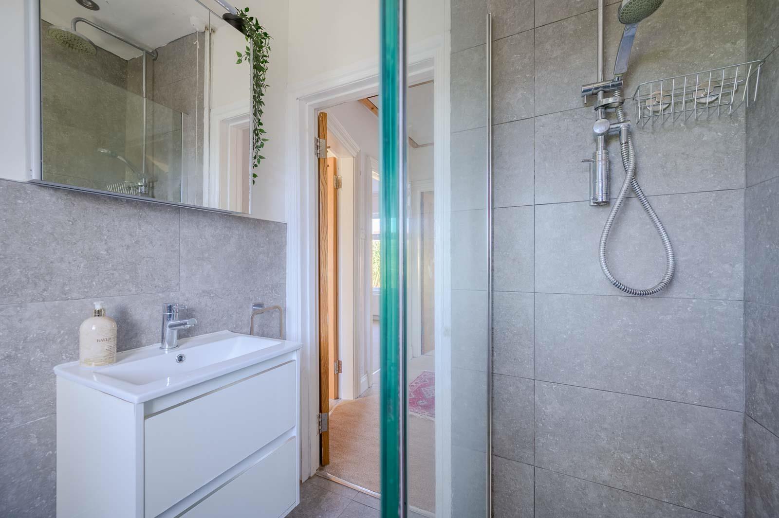 Upstairs, the property boasts three bedrooms, two of which are doubles, offering flexibility for family living or home office space. The stylish shower room features a walk-in shower, modern tiling, and high-quality fixtures.