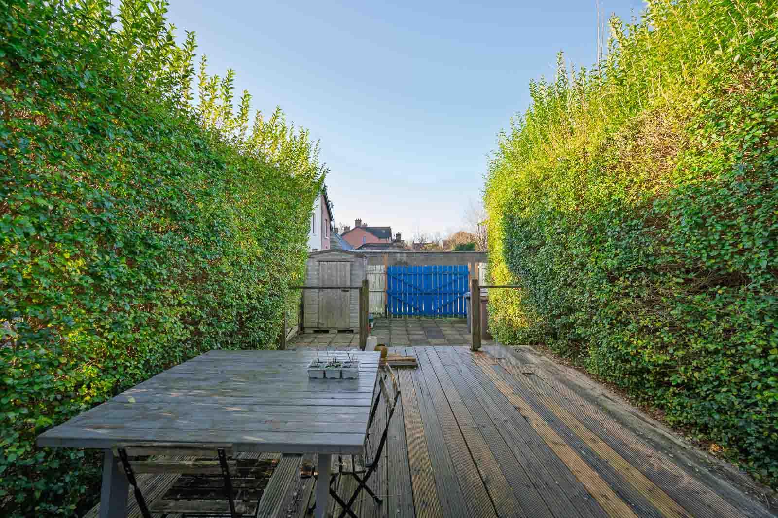 Enclosed Rear Garden with Timber Decking and Mature Hedging Ensuring Privacy and a Low-Maintenance Outdoor Space
