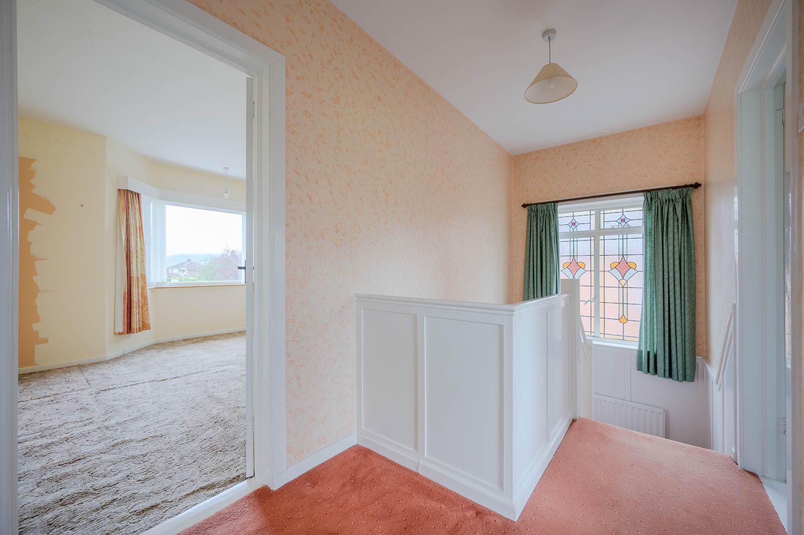 Stained glass single glazed window, part panelled walls.