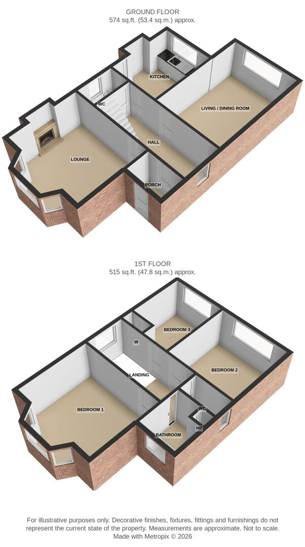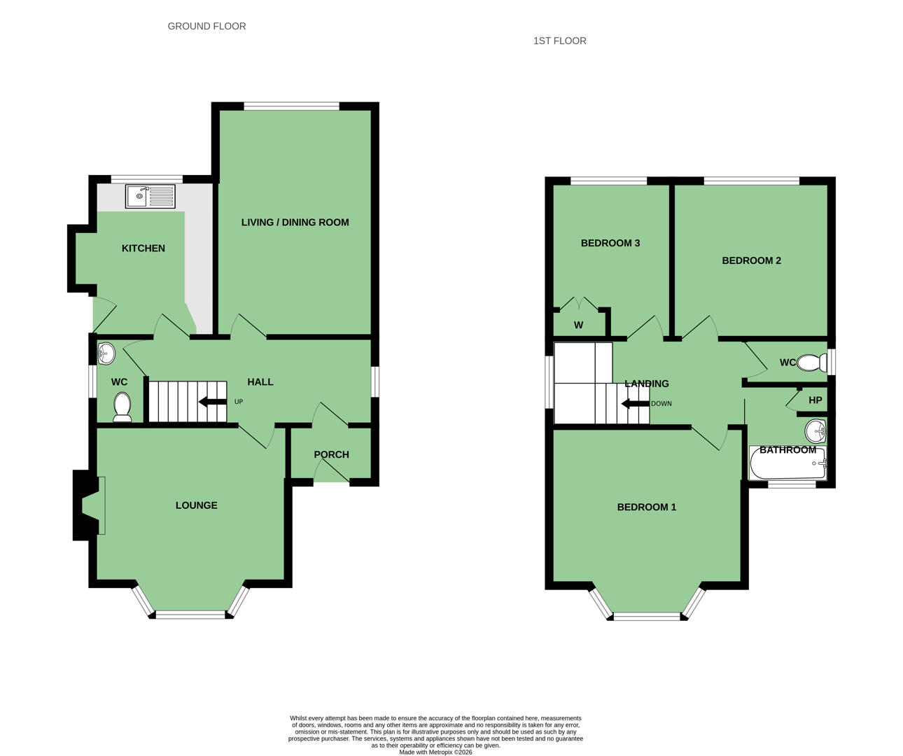 Upstairs, the property offers three well-sized bedrooms, including a spacious principal bedroom with bay window, alongside a family bathroom with separate WC.