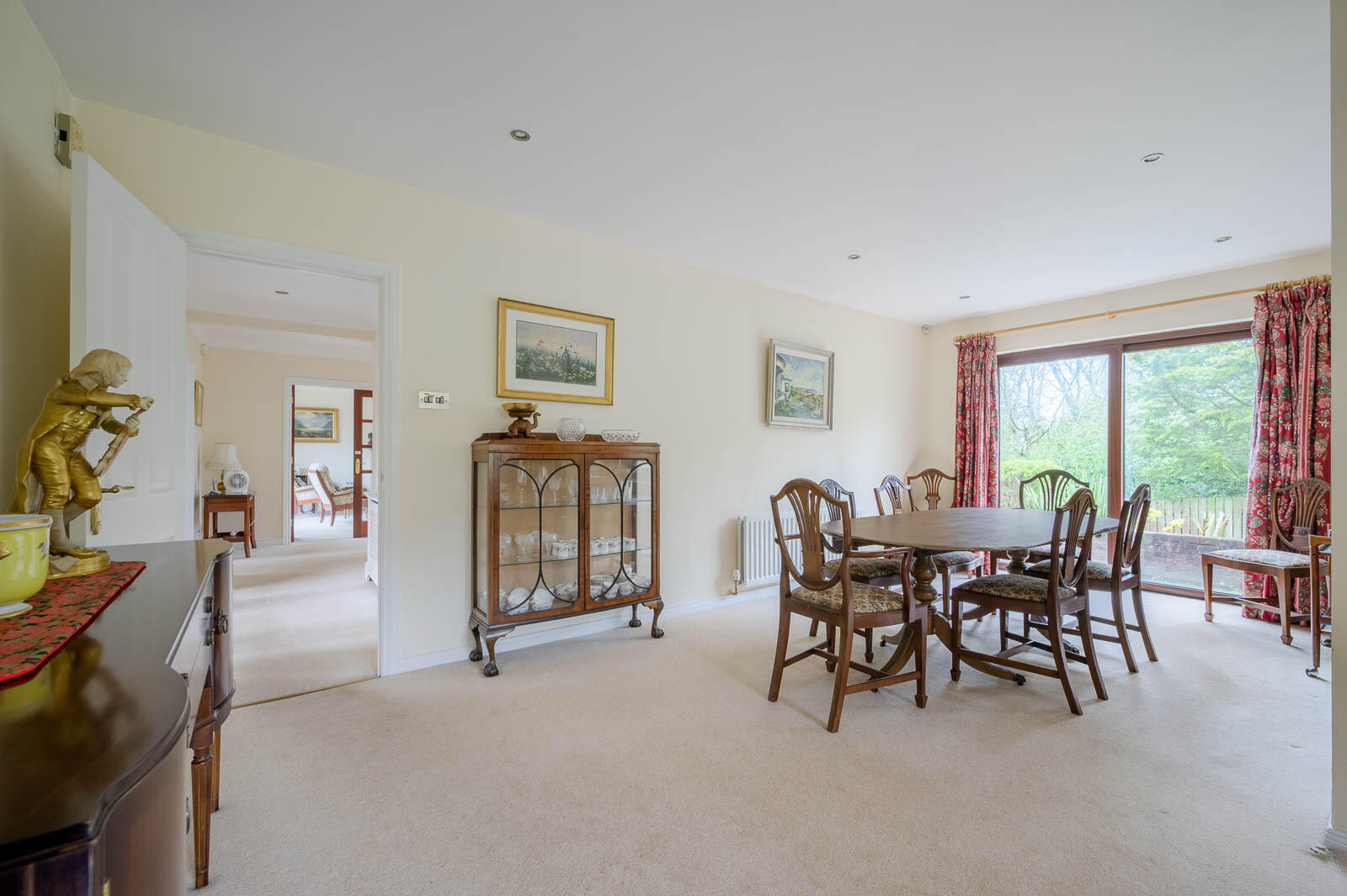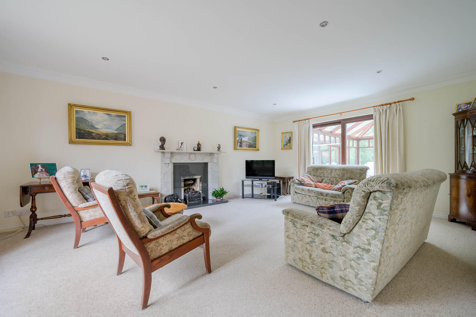 Internally, the home is bright and well laid out, with a welcoming entrance hall leading to a spacious main living room with ample natural light. Double doors open through to a delightful sunroom/conservatory, providing an additional reception space with views over the rear garden.