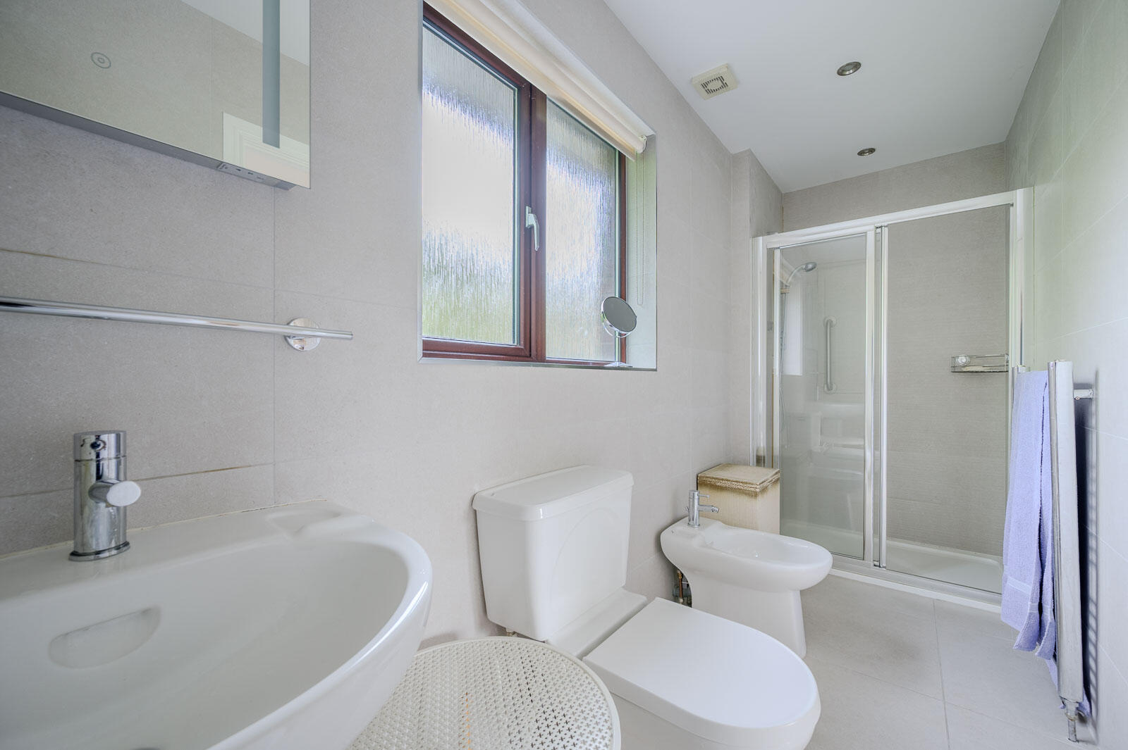 Fully tiled en suite shower room, tiled shower cubicle with thermostatic shower, bidet, pedestal wash hand basin, low flush WC, chrome mixer taps, built-in storage cabinets, illuminated wall hung mirror.