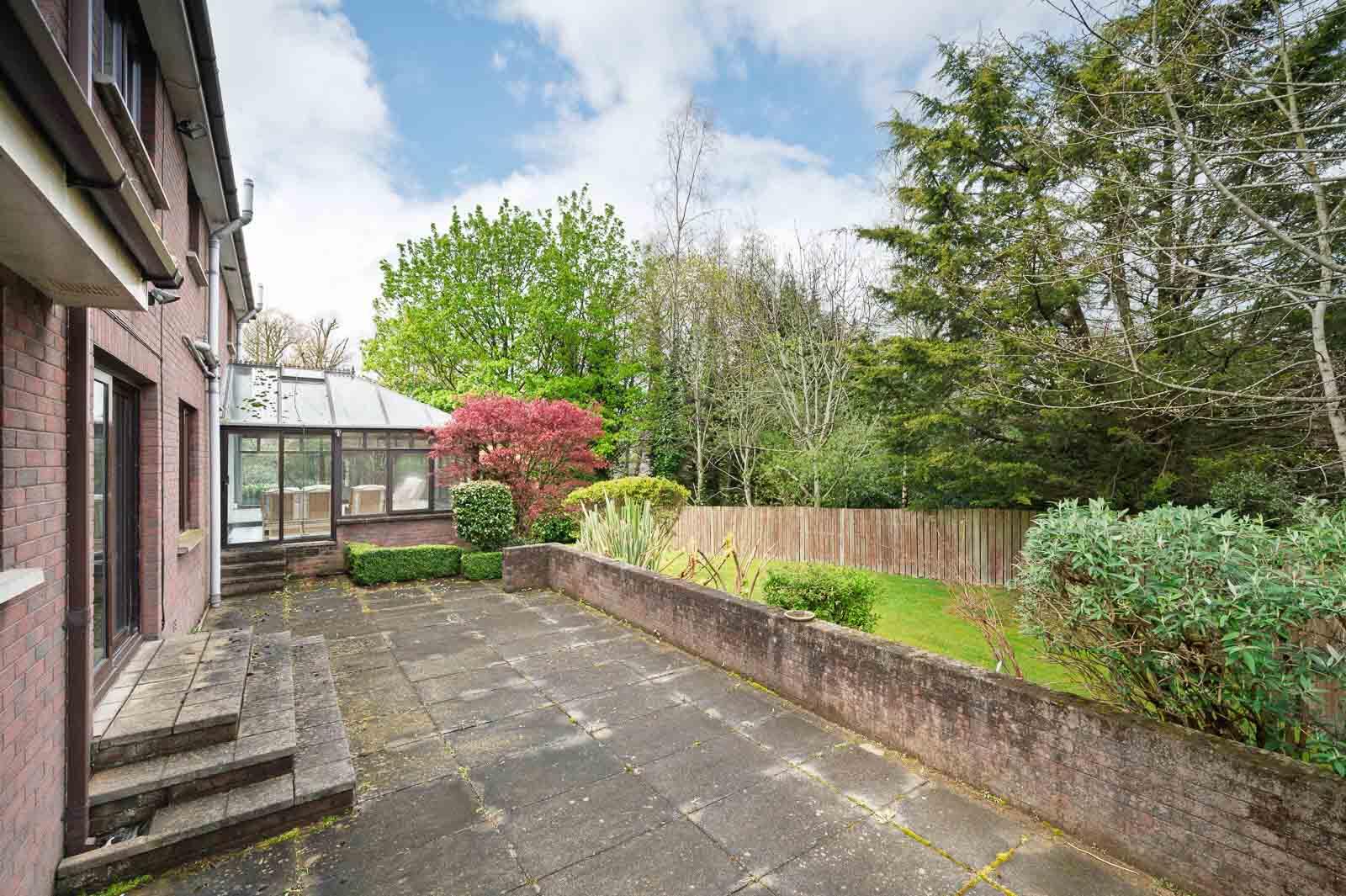 Large patio with mature shrubs and trees, steps down to rear garden in lawn.