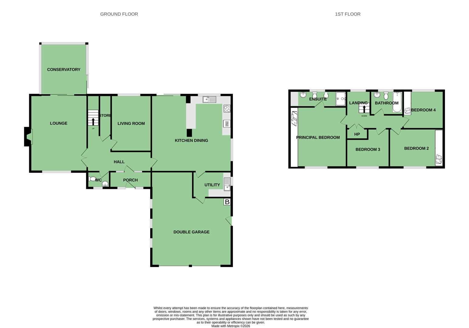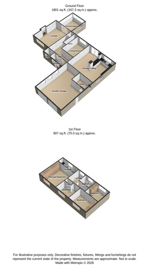 Upstairs, there are four well proportioned bedrooms, including a spacious principal bedroom with built in wardrobes and a modern ensuite shower room. The remaining bedrooms are bright and generously sized, served by a family bathroom fitted with a bath and overhead shower.