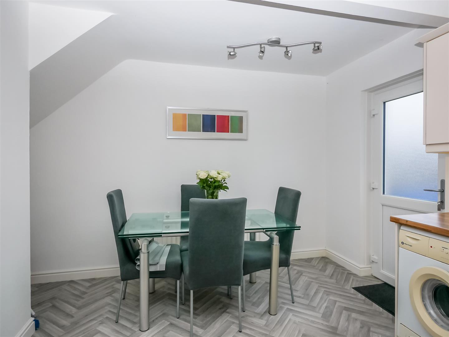 Full range of high and low level units, single drainer 1 1/4 bowl sink unit with mixer taps, formica work surfaces, part tiled walls, 4 ring hob and under oven, plumbed for washing machine, dryer space, fridge freezer space, open to the dining area,