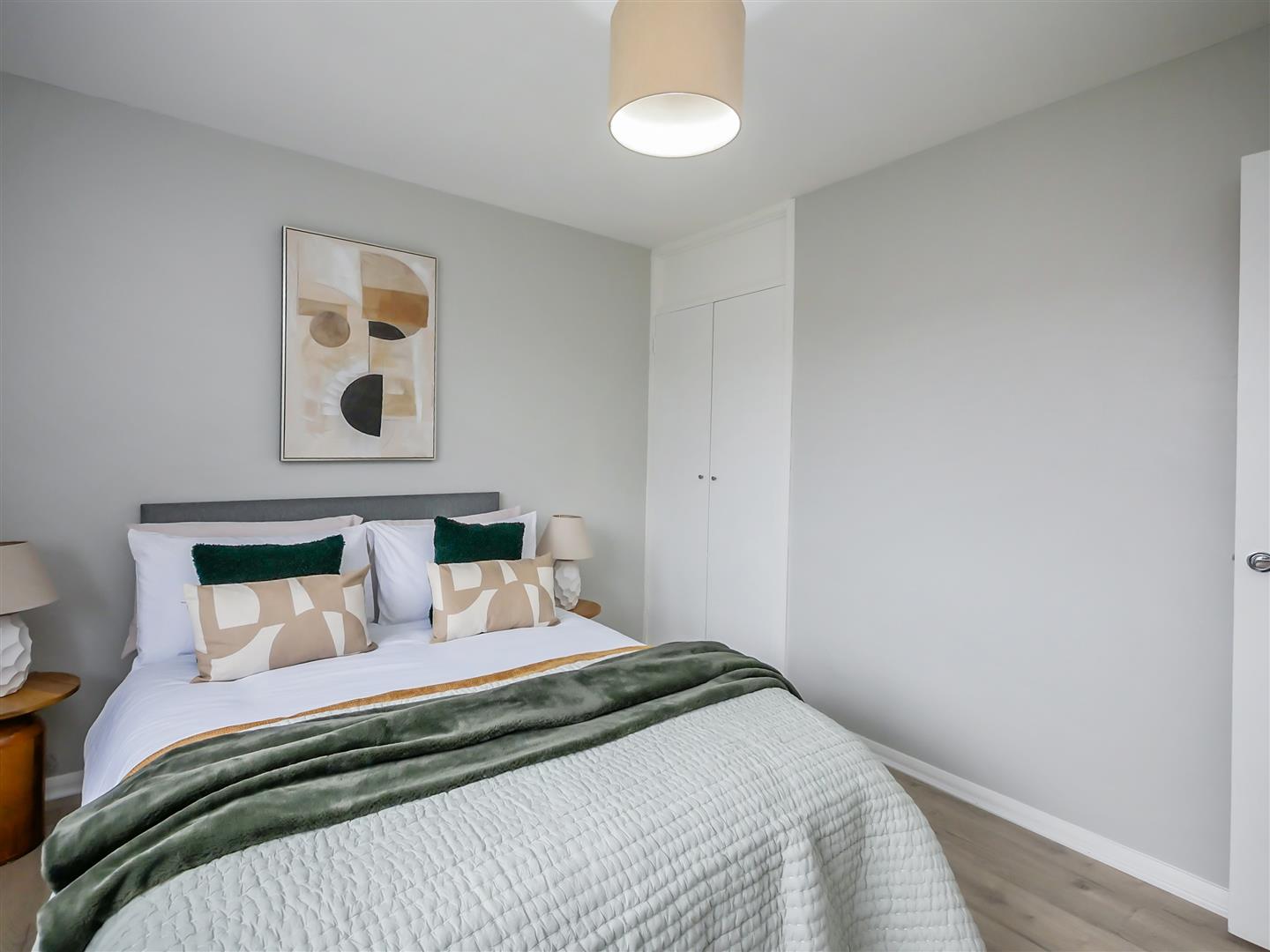 Spacious double bedroom with laminate flooring and built-in storage cupboard.