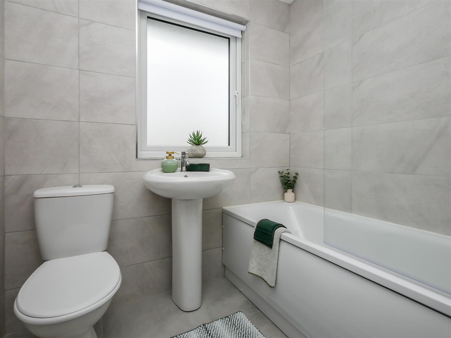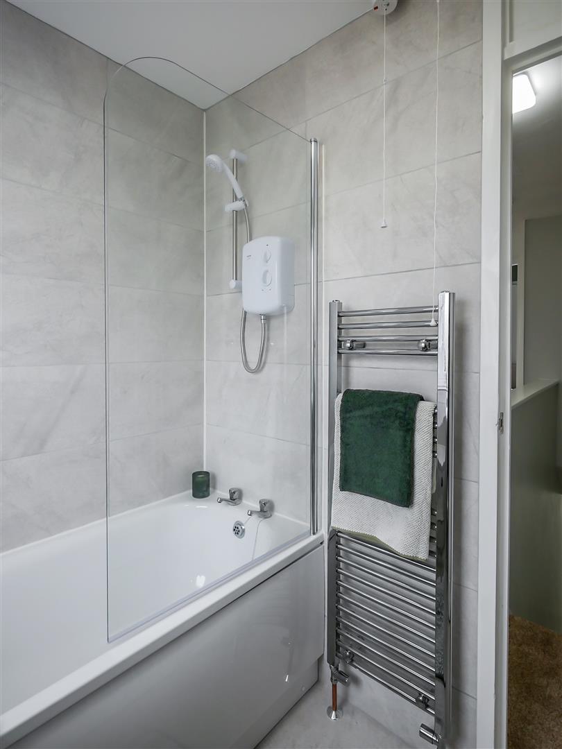 Contemporary white bathroom suite comprising of panelled bath with stainless steel mixer taps and over hanging electric 'Triton' shower, pedestal wash hand basin with stainless steel mixer taps, low flush w.c and heated chrome towel rail. Grey tiled walls and flooring,