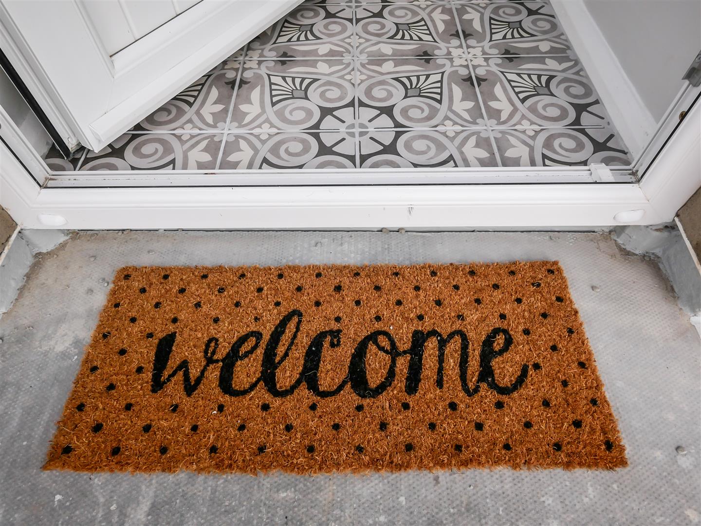 Glazed upvc front door opens onto entrance hall with feature tiled flooring.