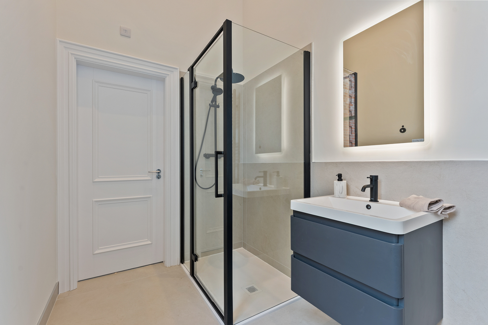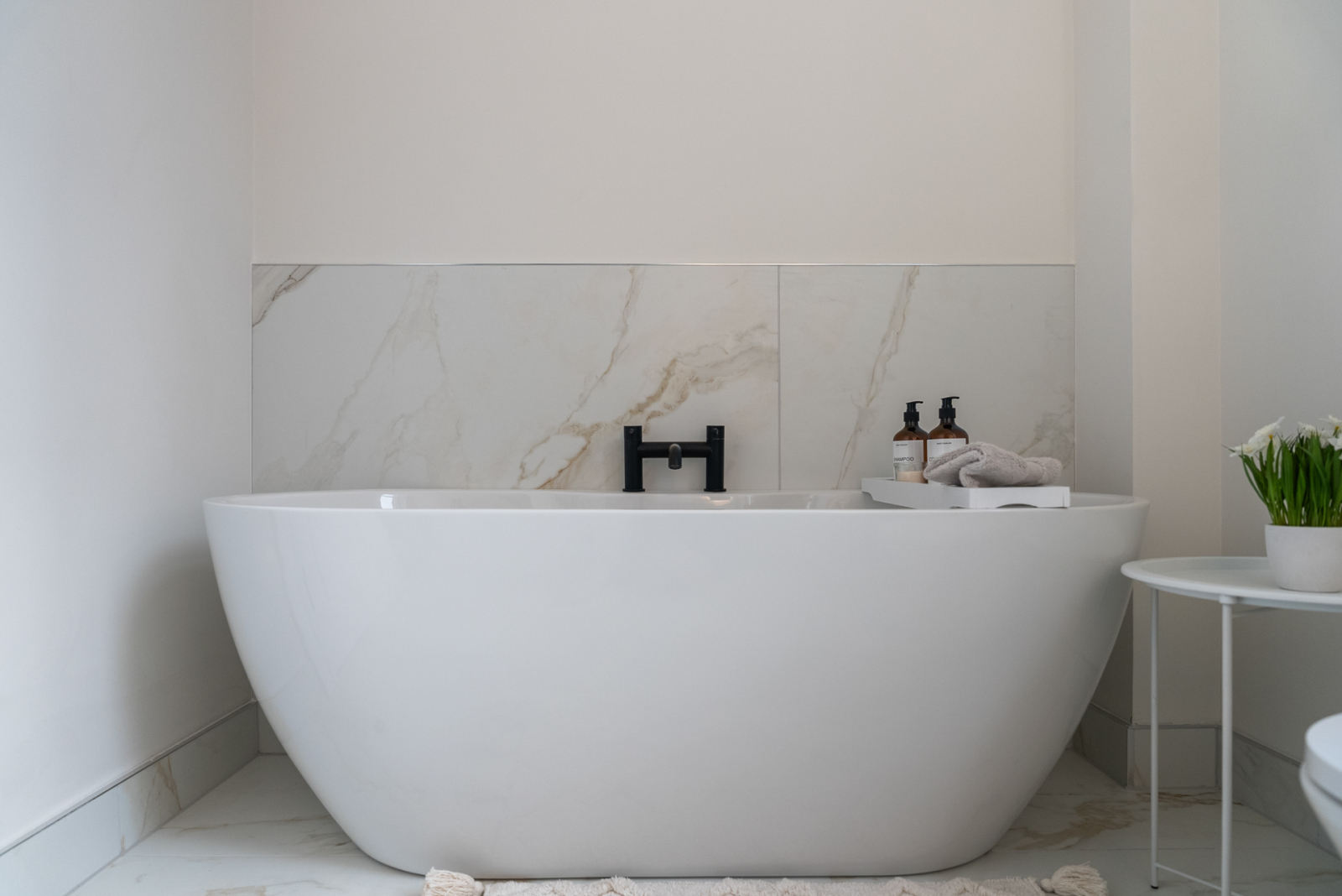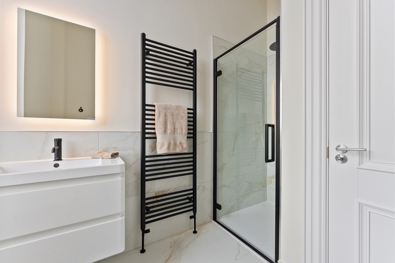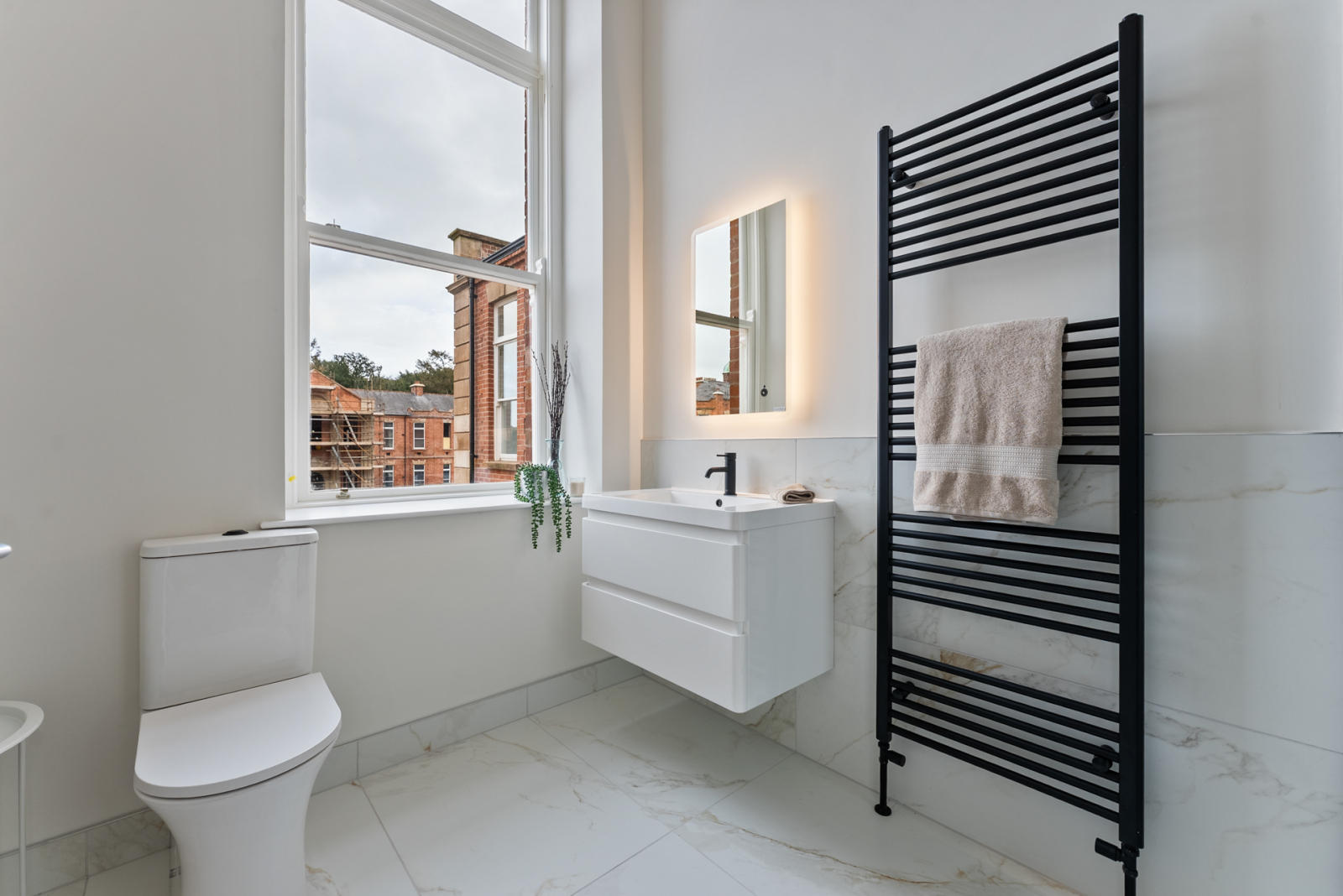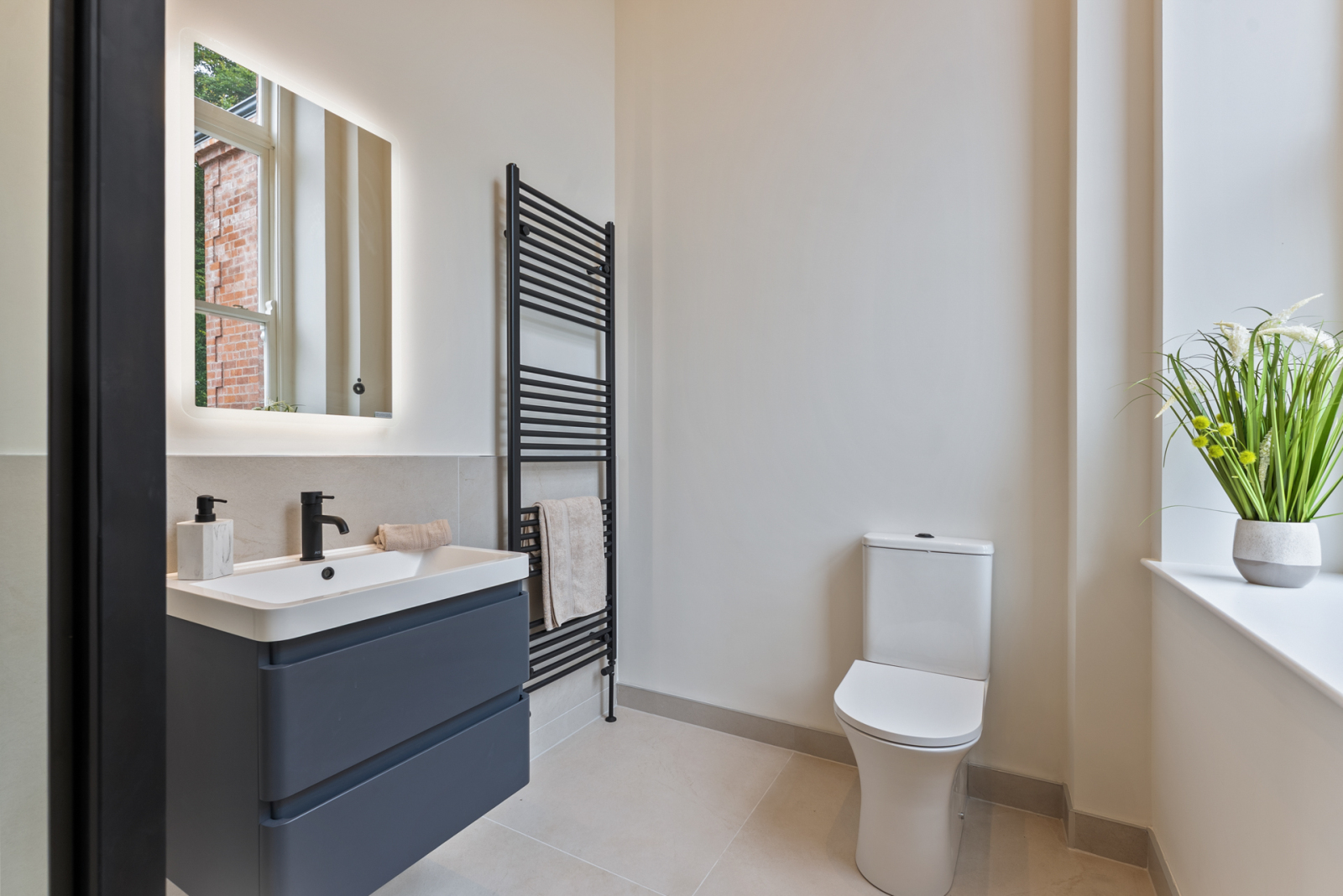 Tiled Floor, grosvenor vanity unit, black towel radiator