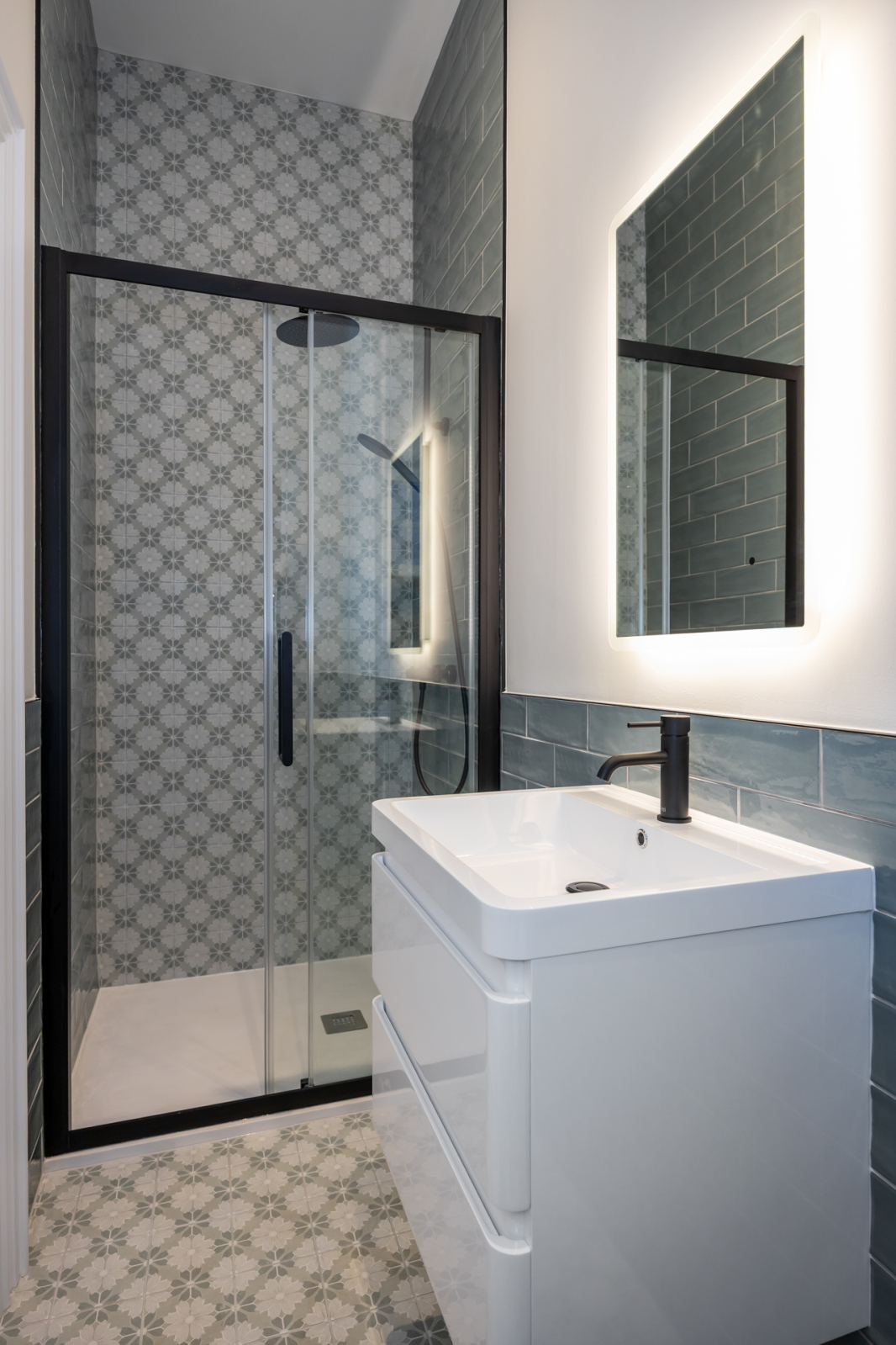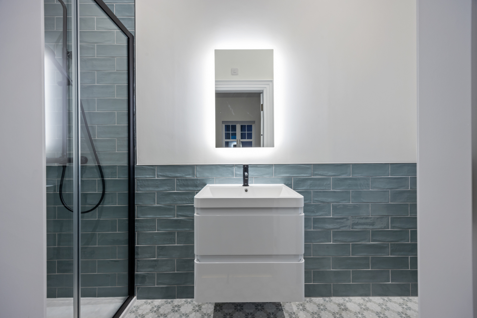 Carmen Serena Squa Floor Tile and Feature Wall Tile on Back Wall of Shower, Turquoise Wall Tile, Marine Black Shower Kit and Door, White Grosvenor Vanity Unit, Ryver Vanity Unit Tap, Back to Wall Toilet