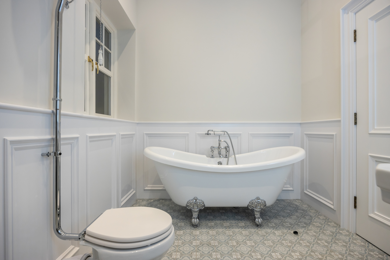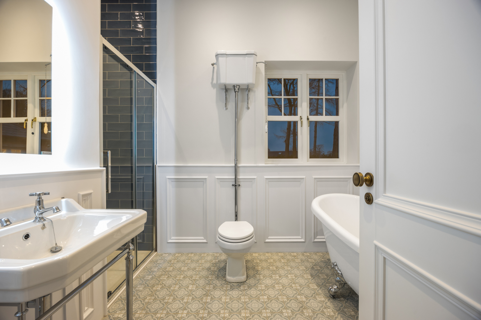 (Min) Carmen Siena Denim Floor Tile, Carmen Siena Denim Feature Wall Tile on Back Wall of Shower, Tourmaline Rustic Brick Tile, Traditional Claw Feet Freestanding Bath Complete with Roll Top Chrome Bath Handle, Westbury Basin, Farnham Basin Taps, Westbury High Level Toilet and Polished Chrome Trim