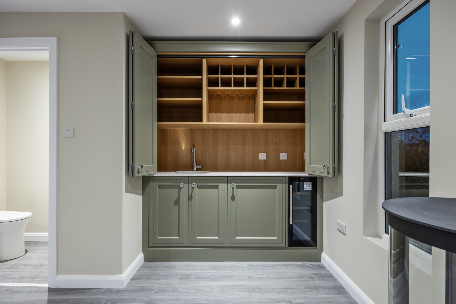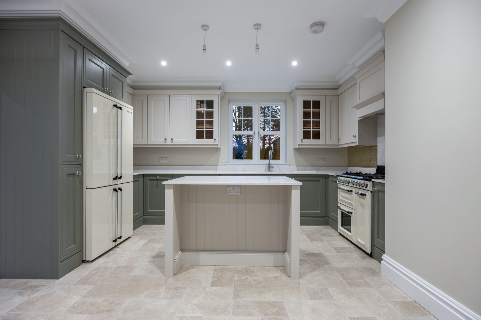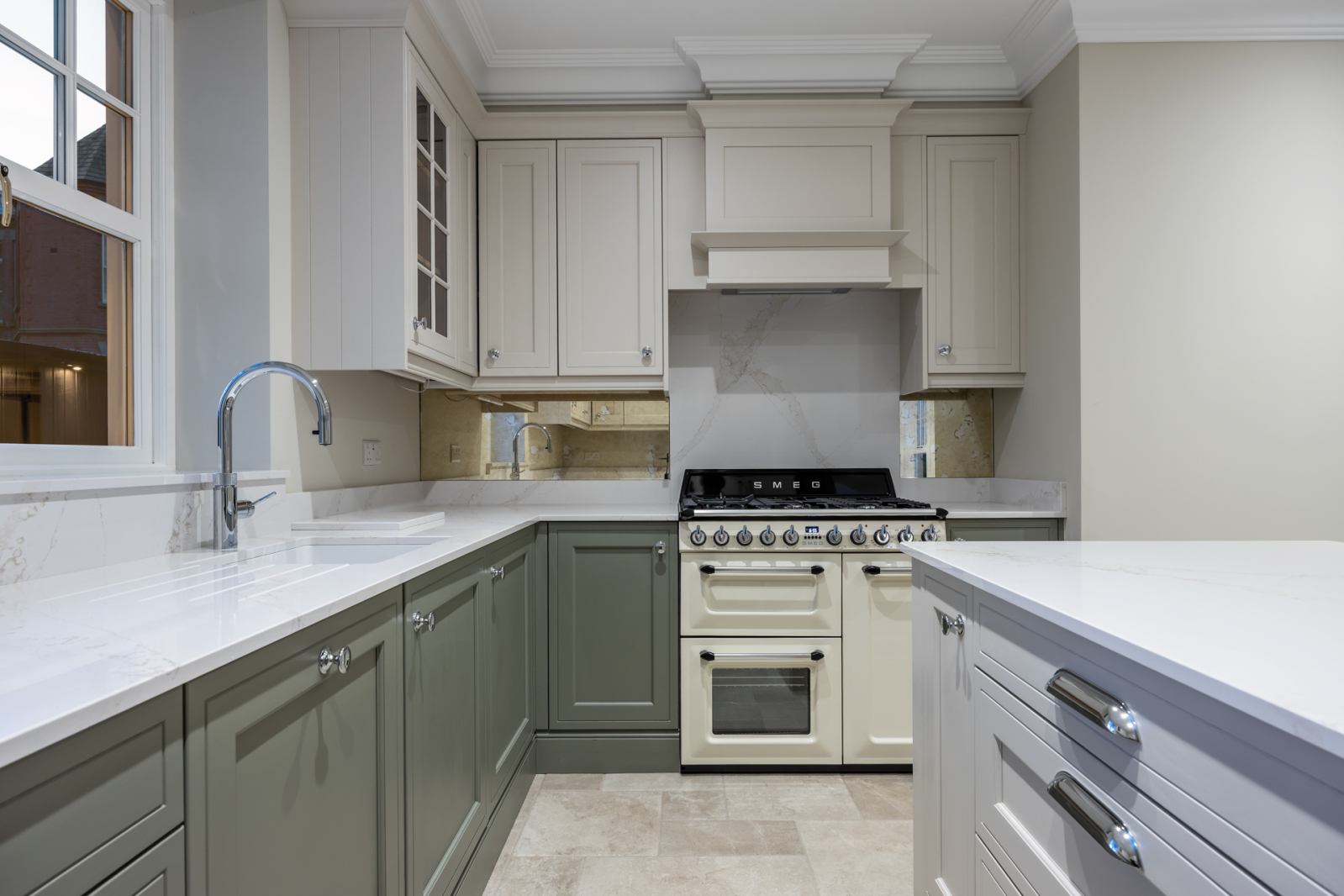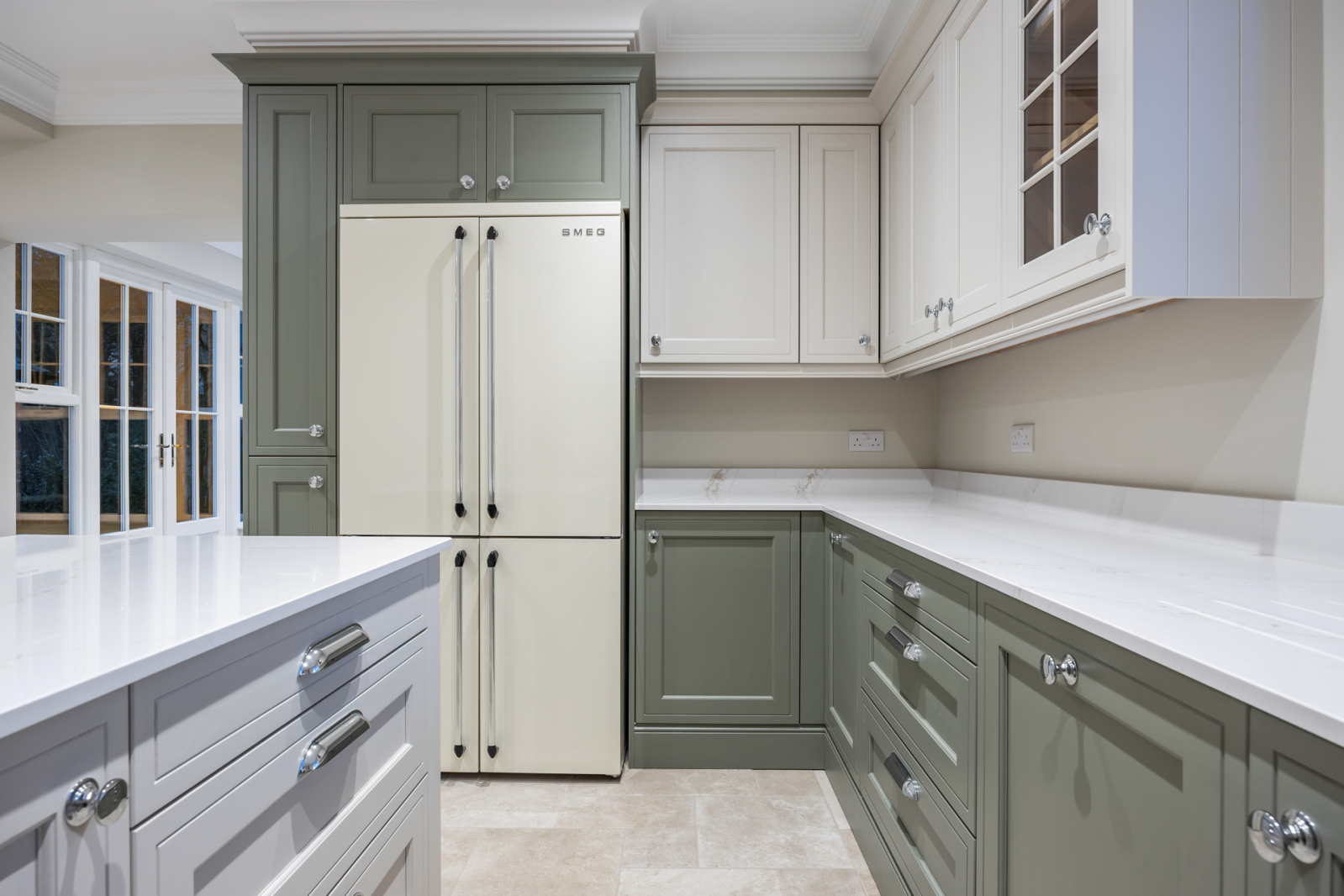 Tram Modular Beige Tile, Winslow Cupboard Doors in Cardamom, Winslow Island and Wall Units in Shell. Bronze River Quartz Worktop, White Composite Sink, Quooker Fusion Polished Chrome Kitchen Tap, SMEG Victoria Four Door Fridge/ Freezer in Cream, Dishwasher, SMEG Victoria Dual Fuel Range Cooker in Cream, Cabra Fireplace in Polar White, EKO Flueless Fire Stove, Cornicing