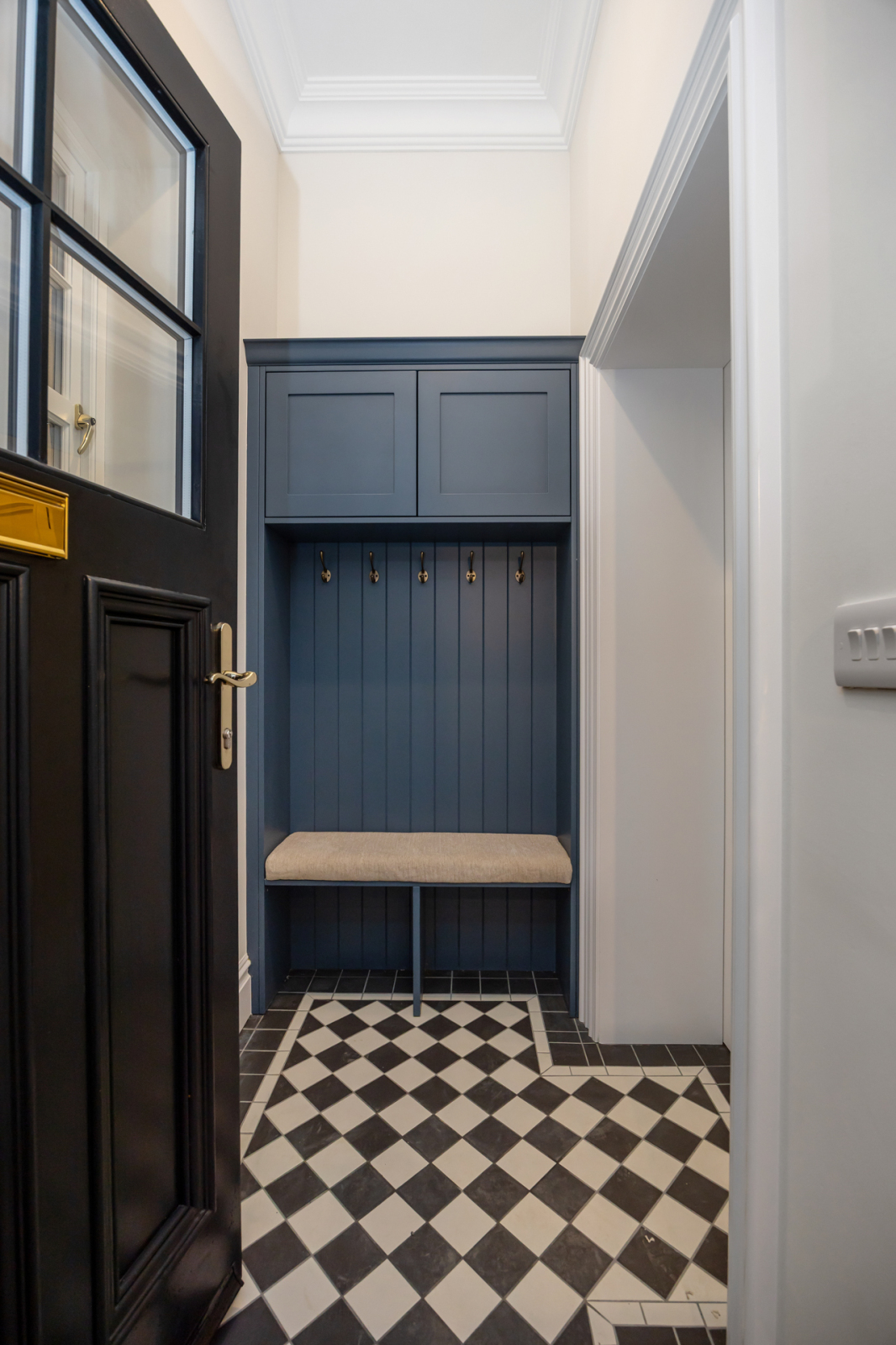 Black & White Checkered Double Border Floor Tile, Navy Bespoke Bench with Built In Seat with Shoe and Coats Storage within Porch, White Paneling in Hallway