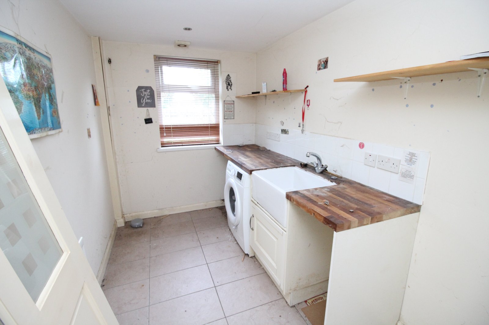 The utility has a range of units, round basin with mixer tap, and washing machine.