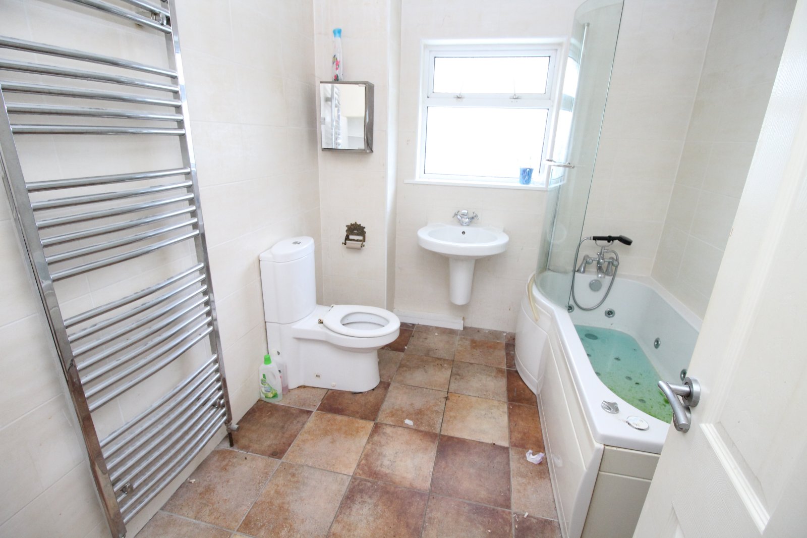 The bathroom has a three piece suite to include a low flush wc, wall mounted wash hand basin with mixer tap, and a bath with handheld shower unit. There is also a heated towel rail and the bathroom has a tiled floor and tiled walls.