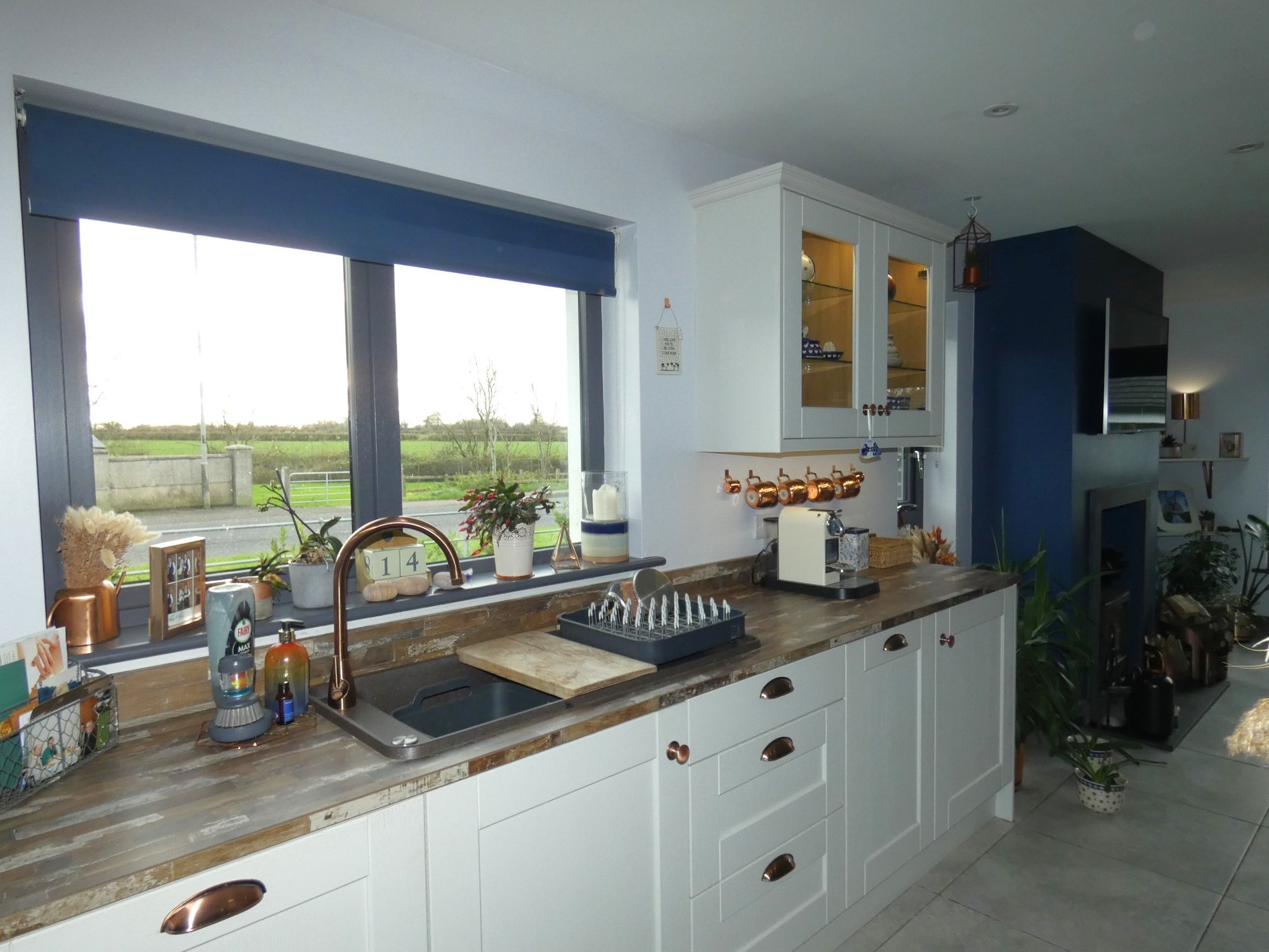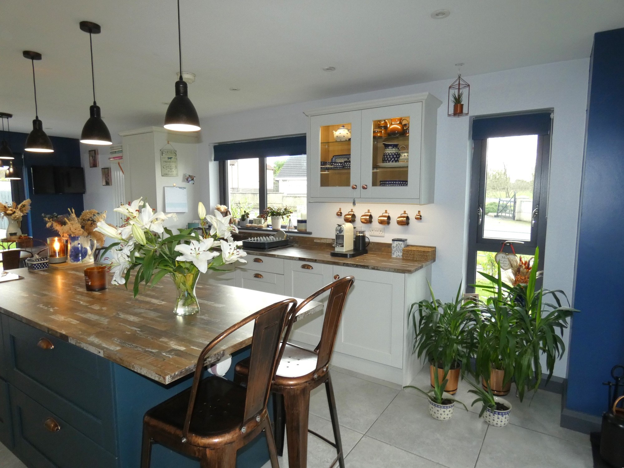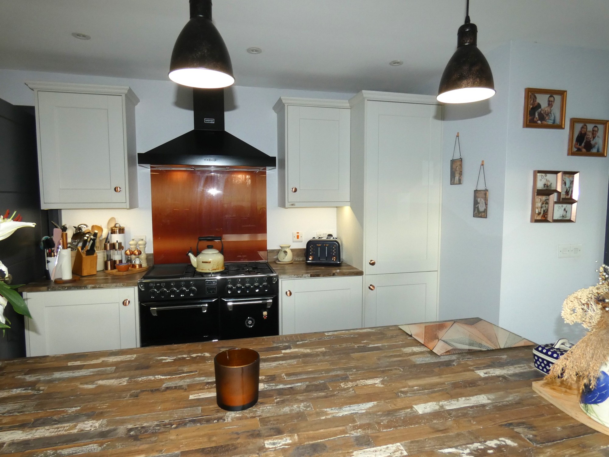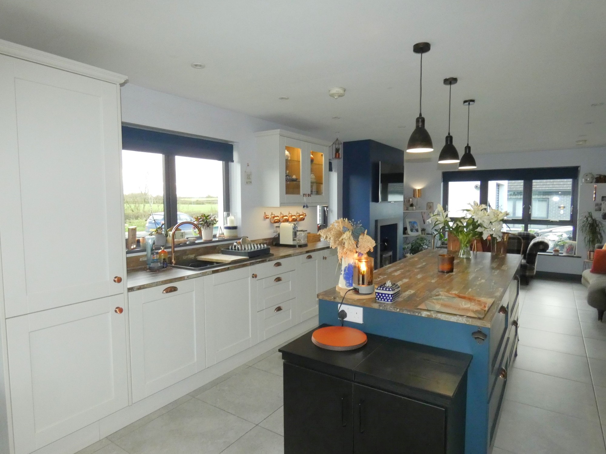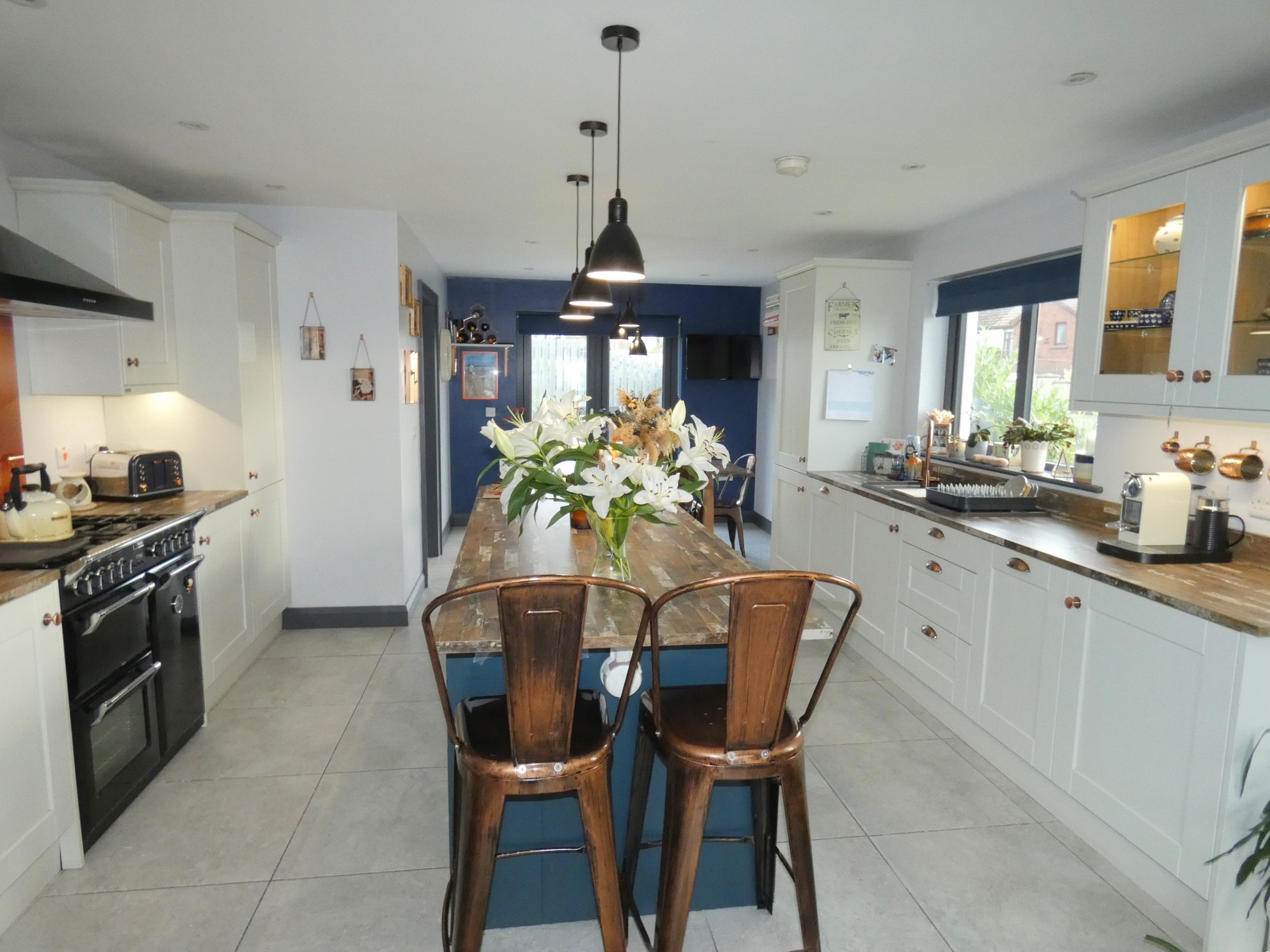 Attractive range of eye and low level units including stoves range which incorporates 3 electric ovens (one with grill) and 5 ring gas hob, stoves extractor fan, integrated fridge freezer, integrated dishwasher, integrated multi recycling bin, copper sink unit with copper mixer tap, glass display units with lighting, concealed lighting below eye level units, matching shelving to kitchen units, feature centre island with a range of cupboards and large drawers, (one of the drawers incorporates a hidden cutlery drawer), tiled floor, ceiling downlights.