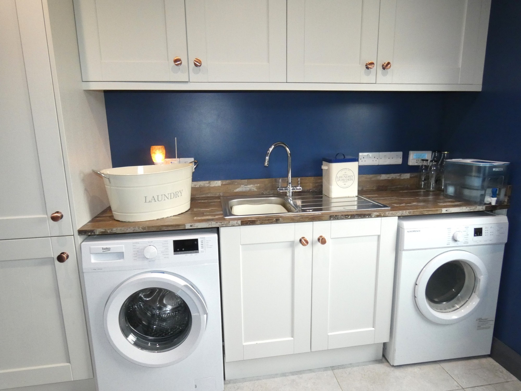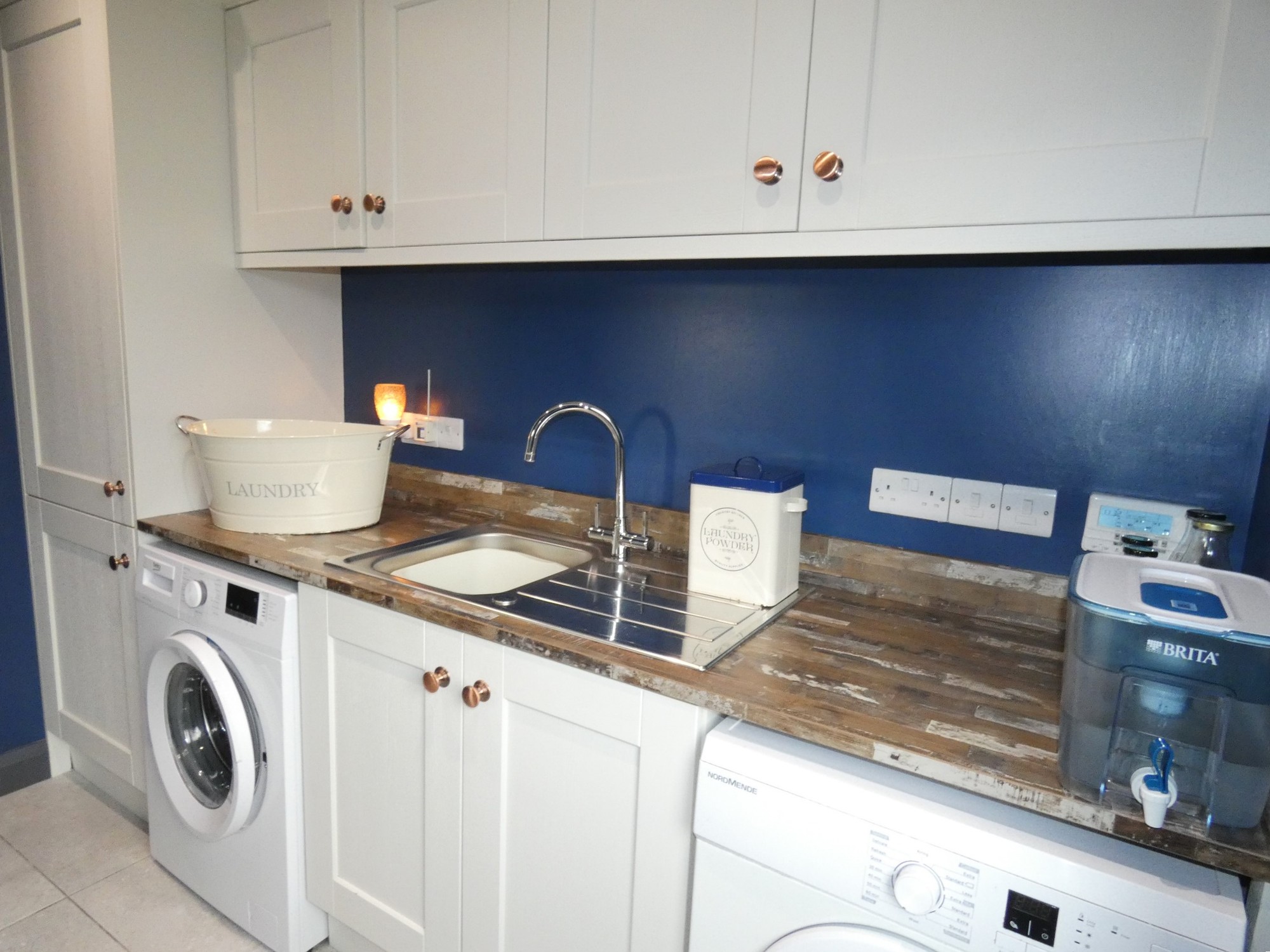 With a range of fitted storage units including "Pyranis" stainless steel sink unit with mixer tap, storage cupboard has an electric point for a microwave, plumbed for an automatic washing machine, space for a tumble dryer, tiled floor, extractor fan, ceiling downlights.