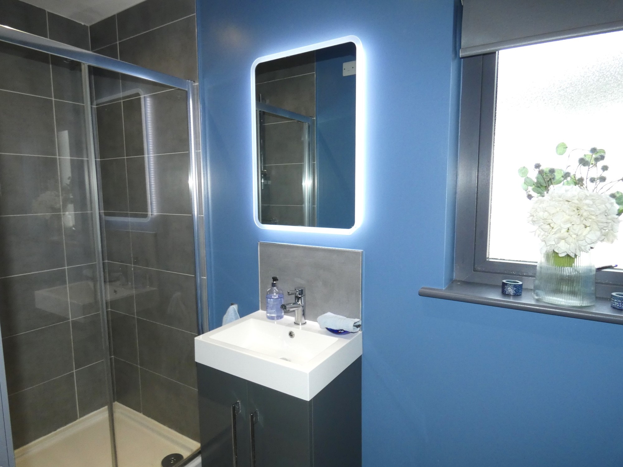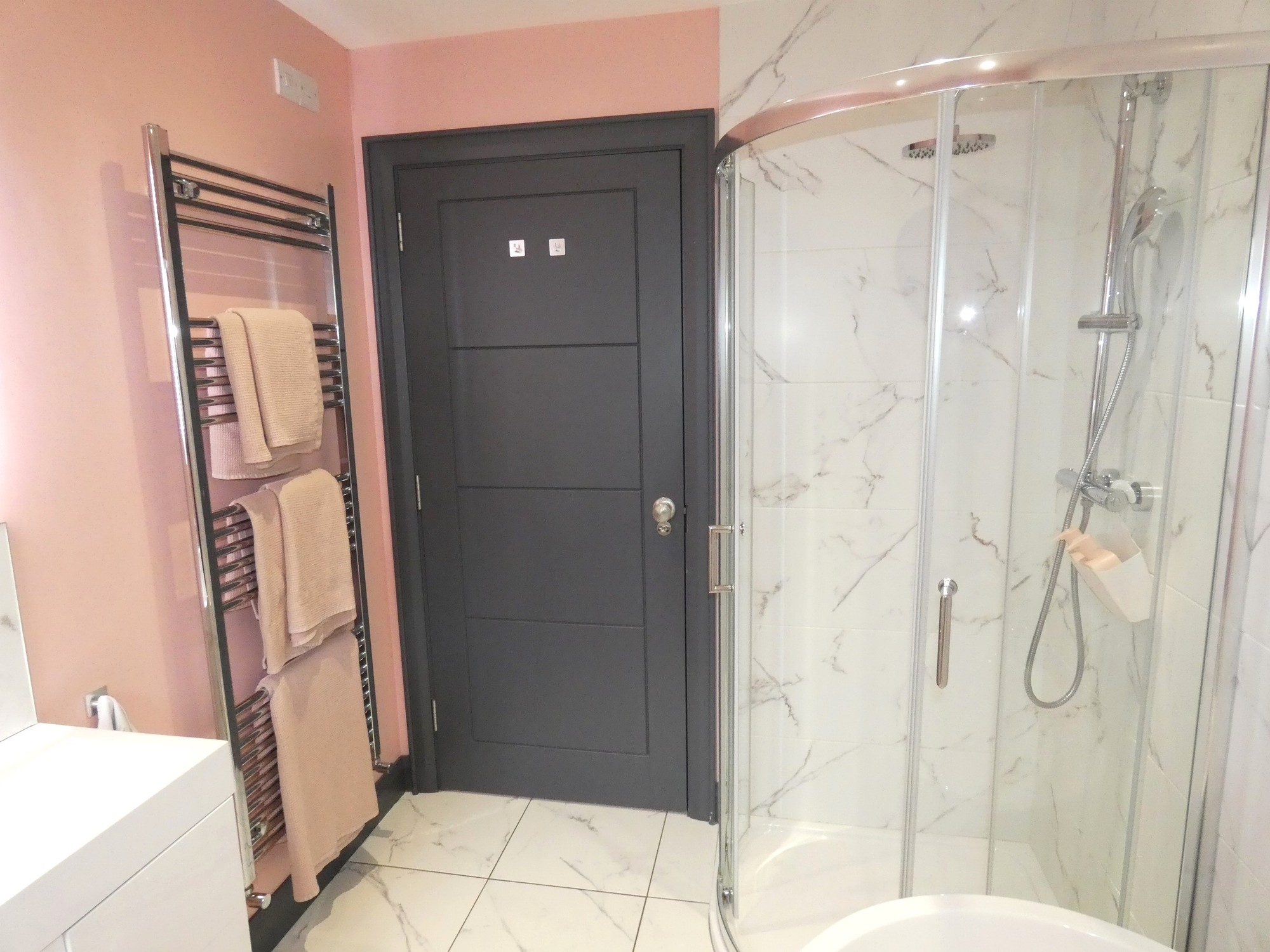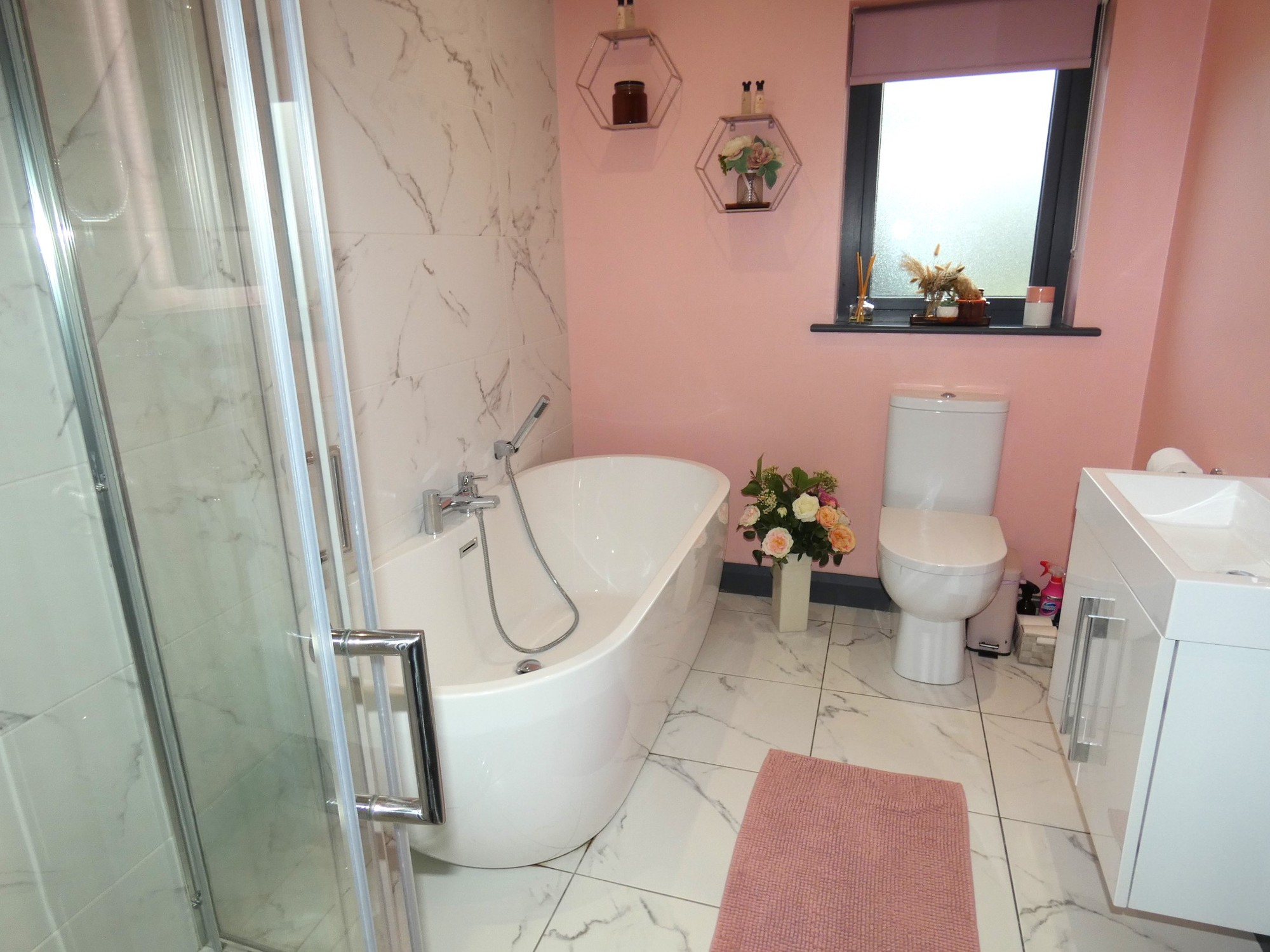 With fitted suite including free standing oval bath with mixer tap and telephone hand shower, tiled shower cubicle with thermostatic shower with telephone hand shower and rainfall type shower head, w.c, wash hand basin with tiled splashback, storage cupboards below, touch control led mirror, heated towel rail, tiled floor, part tiled walls, ceiling downlights (automatic) extractor fan.
