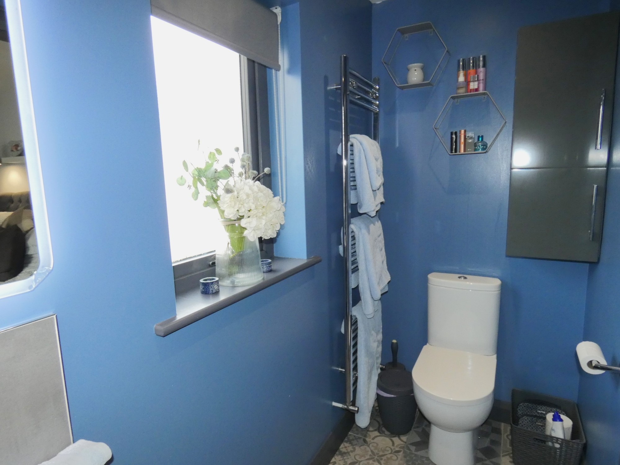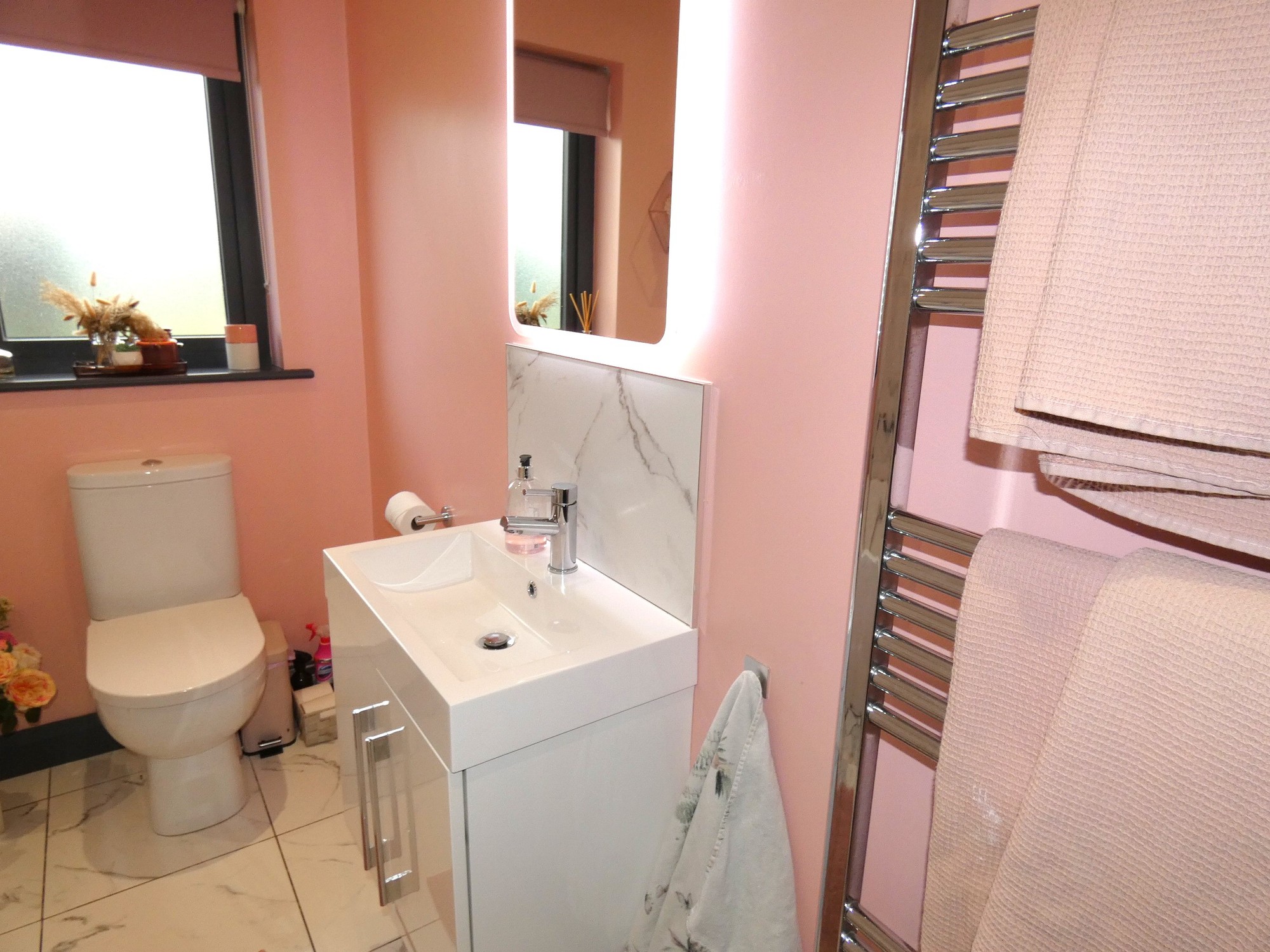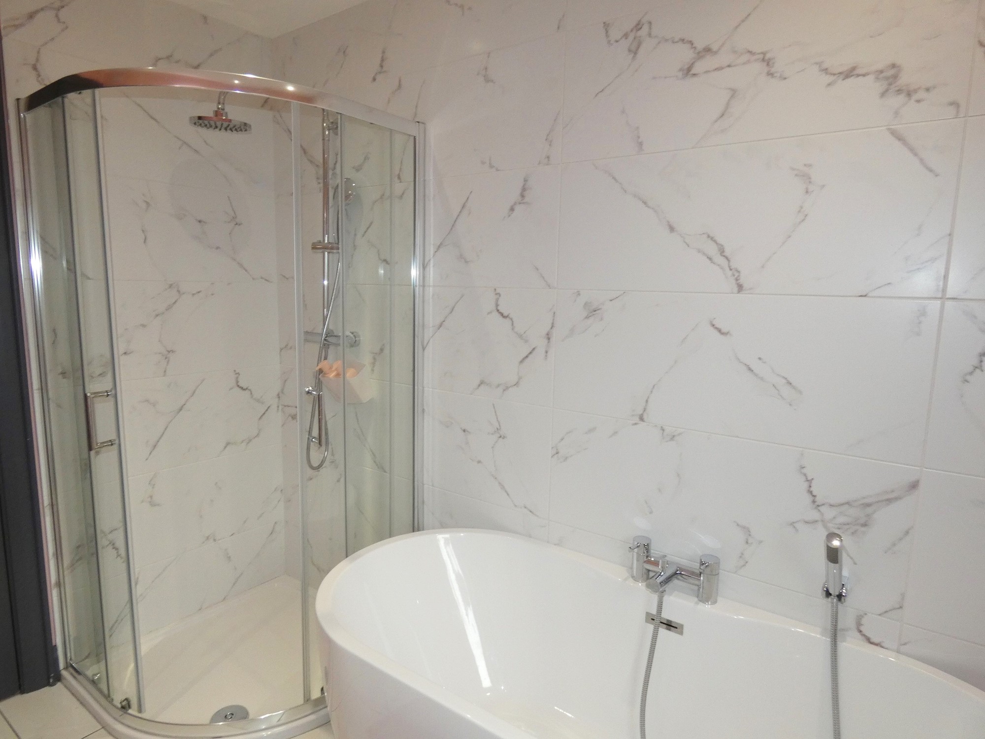 With fitted suite including free standing oval bath with mixer tap and telephone hand shower, tiled shower cubicle with thermostatic shower with telephone hand shower and rainfall type shower head, w.c, wash hand basin with tiled splashback, storage cupboards below, touch control led mirror, heated towel rail, tiled floor, part tiled walls, ceiling downlights (automatic) extractor fan.