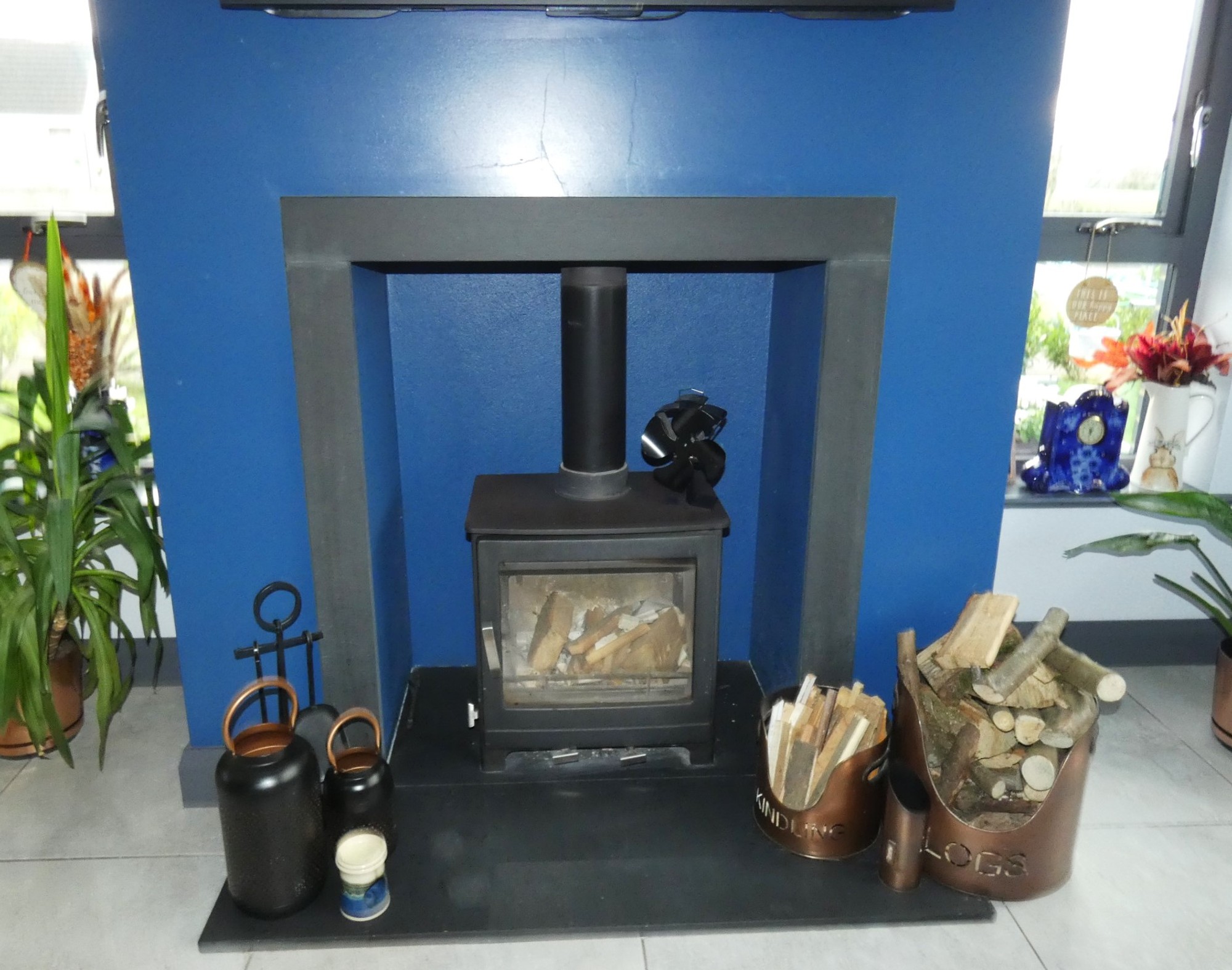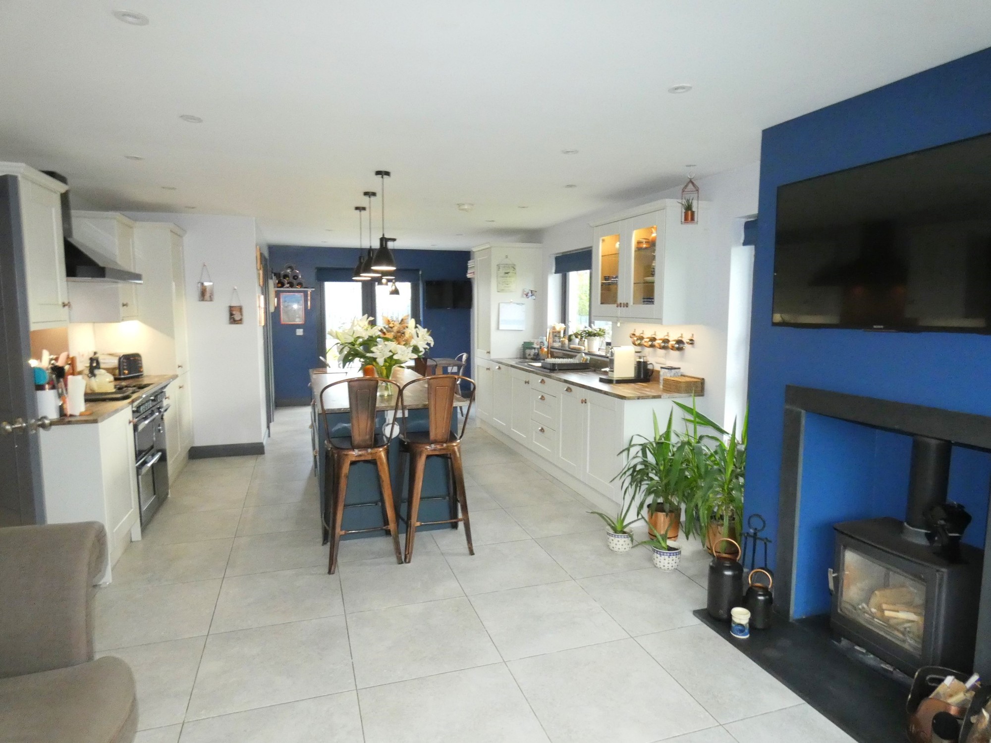 Attractive fireplace with slate hearth, wood burning stove, T.V. point above fireplace, telephone point, double aspect windows, ceiling downlights, tiled floor.