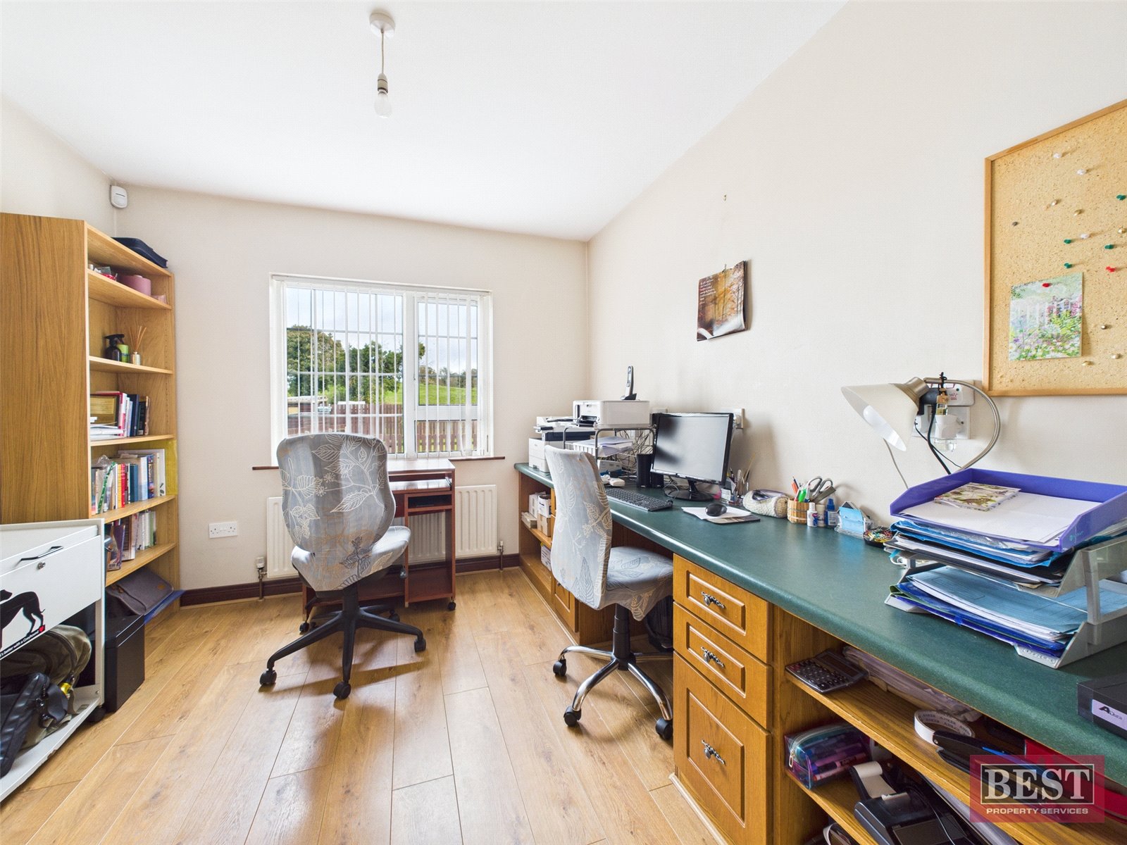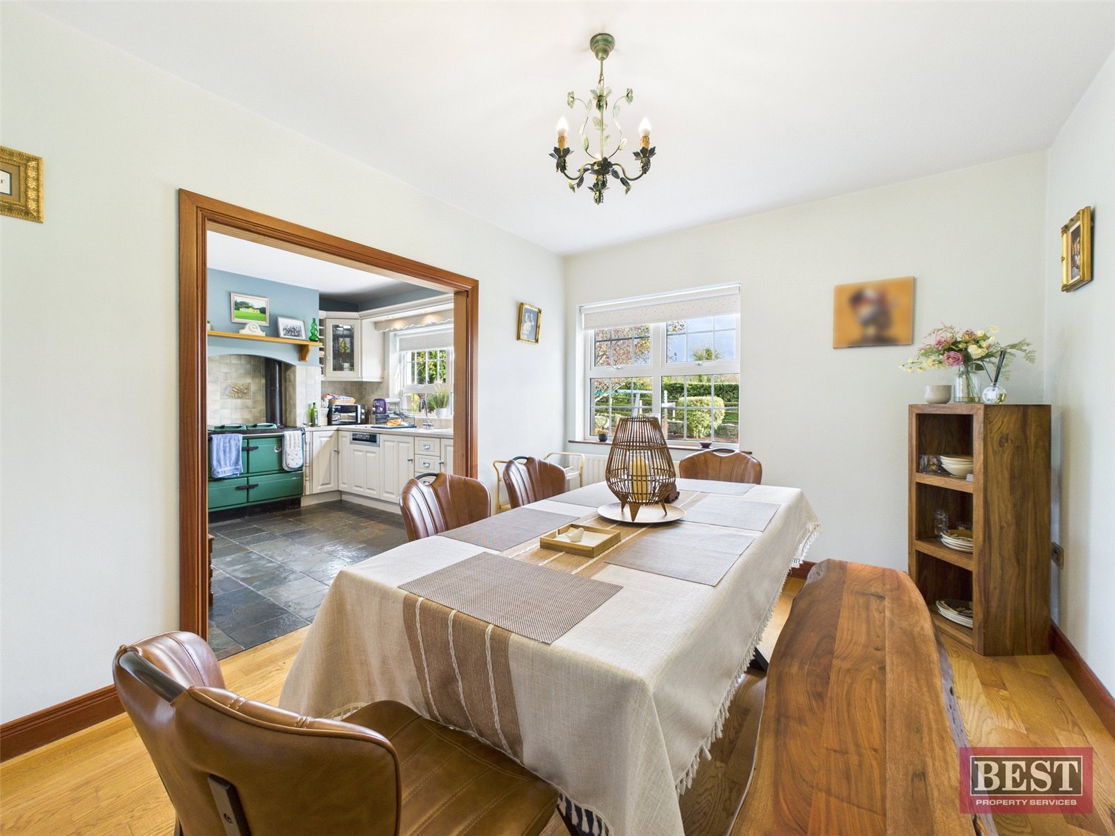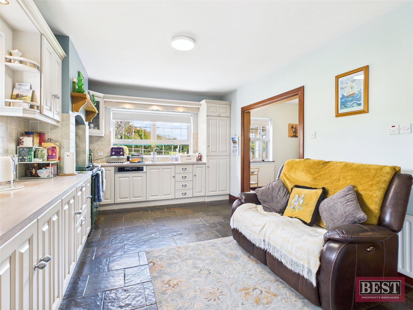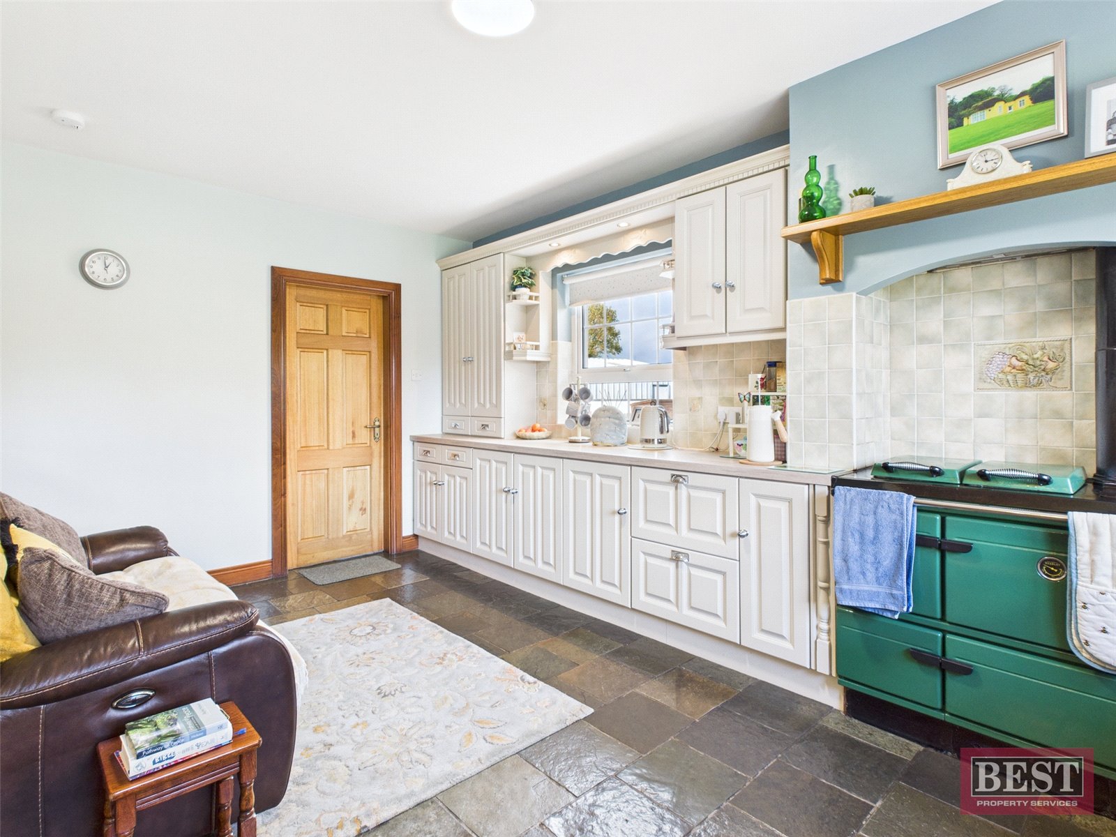 A second living room offers additional reception space, while a home office provides the perfect setting for remote working. The dining room with wooden flooring opens seamlessly through to a kitchen fitted with painted solid units, tiled flooring, partial wall tiling, and a Stanley oil-fired cooker. A separate utility room includes additional units, plumbing for appliances, and access to the rear garden.