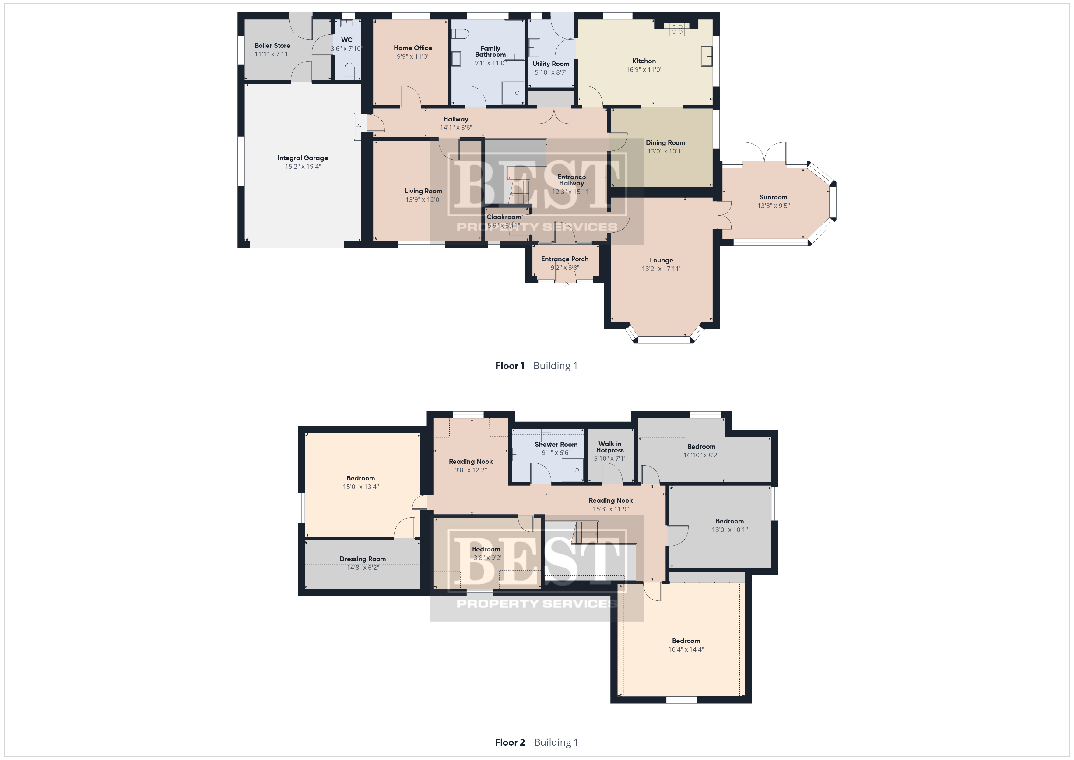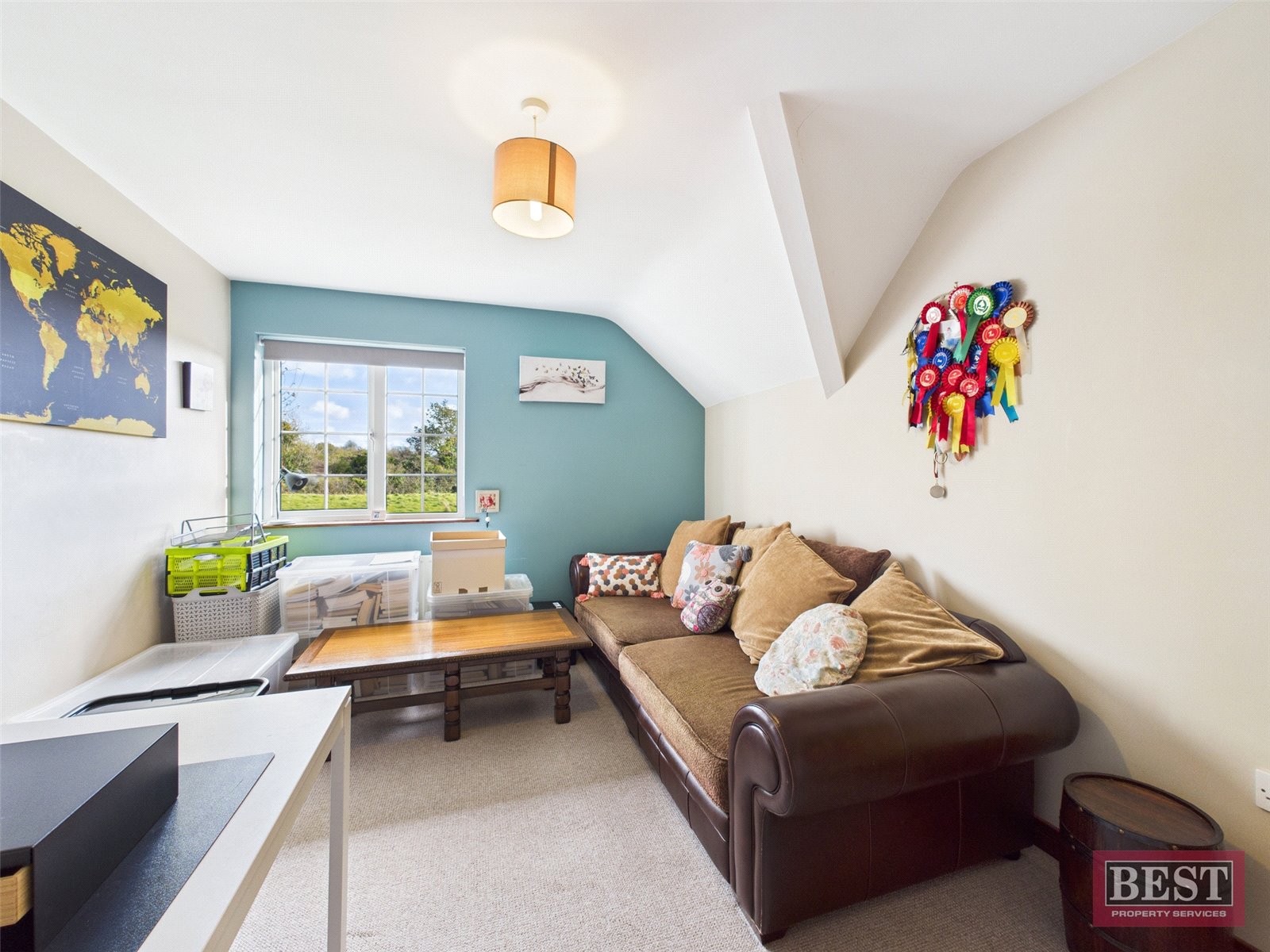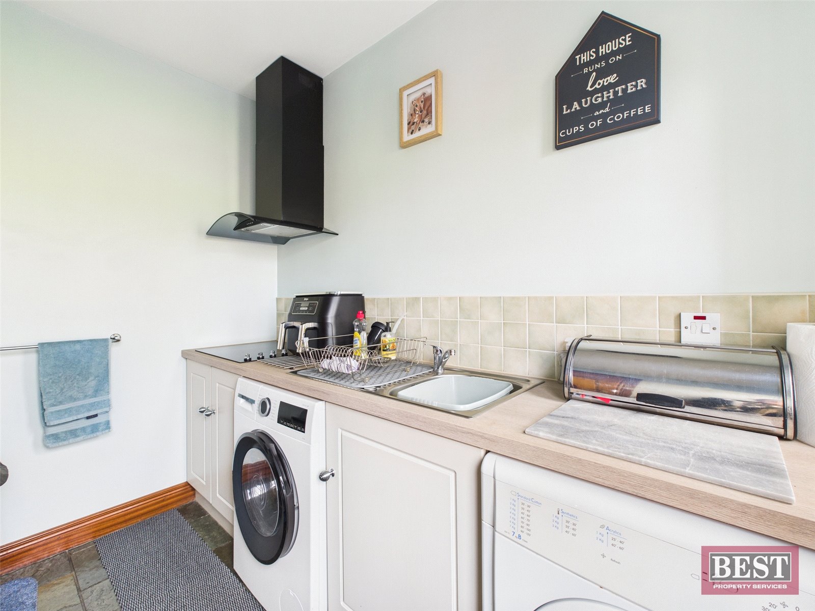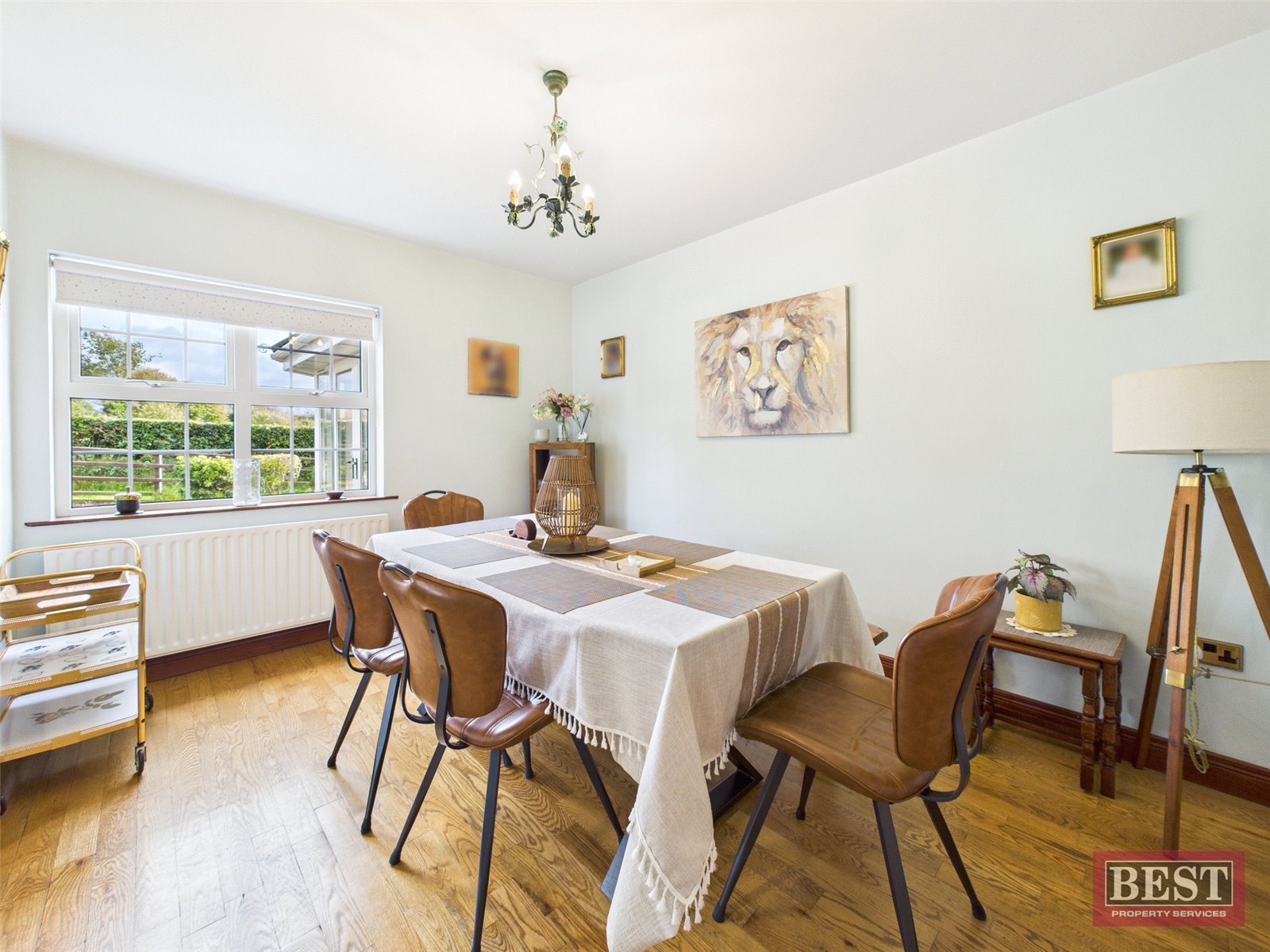 A second living room offers additional reception space, while a home office provides the perfect setting for remote working. The dining room with wooden flooring opens seamlessly through to a kitchen fitted with painted solid units, tiled flooring, partial wall tiling, and a Stanley oil-fired cooker. A separate utility room includes additional units, plumbing for appliances, and access to the rear garden.