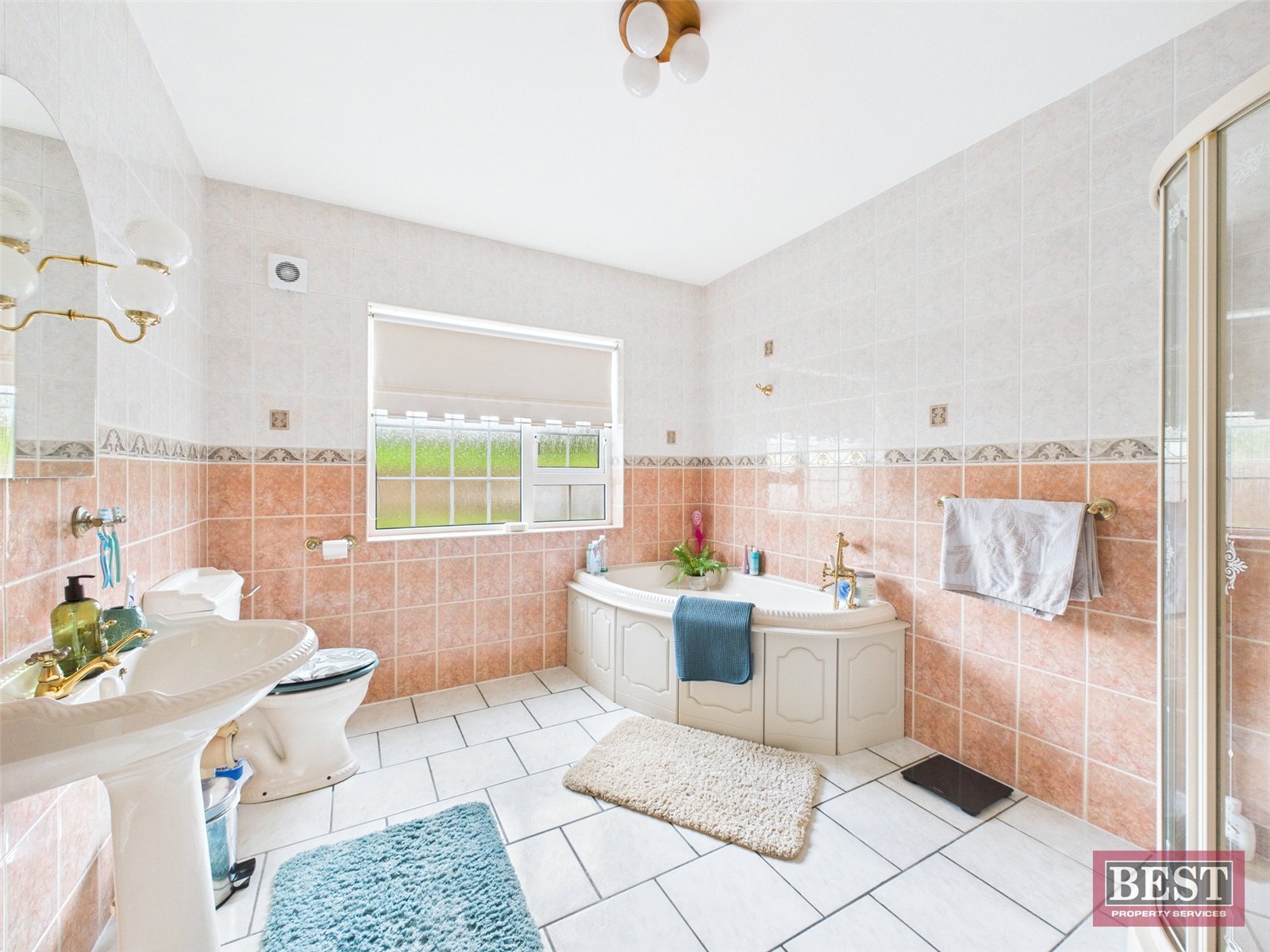 The family bathroom is fully tiled and fitted with a four-piece coloured suite. The integral garage links to a boiler room and separate W.C., offering practical storage and workspace options.