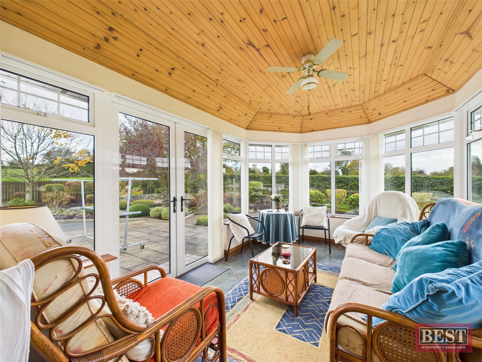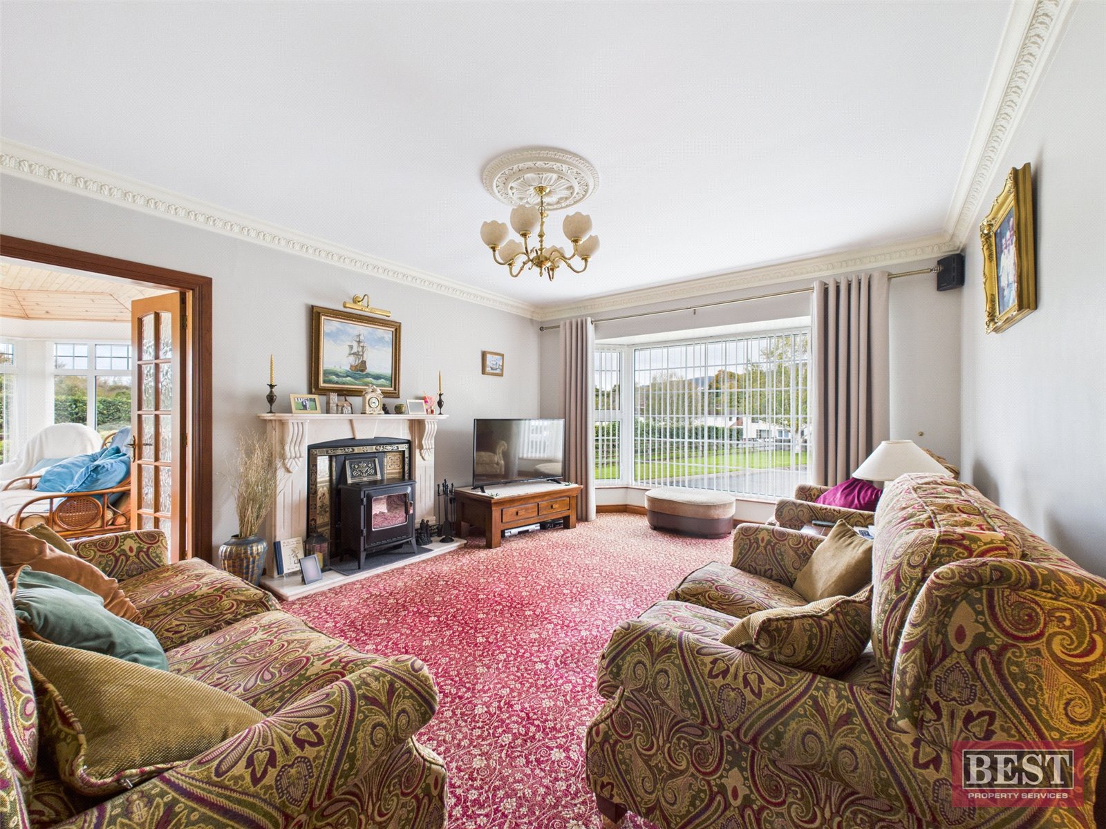 Upon entering, the bright entrance porch with tiled flooring leads through to a spacious inner hallway featuring timber flooring, ceiling coving, and convenient cloak and storage rooms. To the front of the home, the main lounge enjoys a large bay window, marble fireplace with open fire, and double doors opening into a sunroom with tiled flooring and timber ceiling - ideal for relaxing while overlooking the rear patio and gardens.