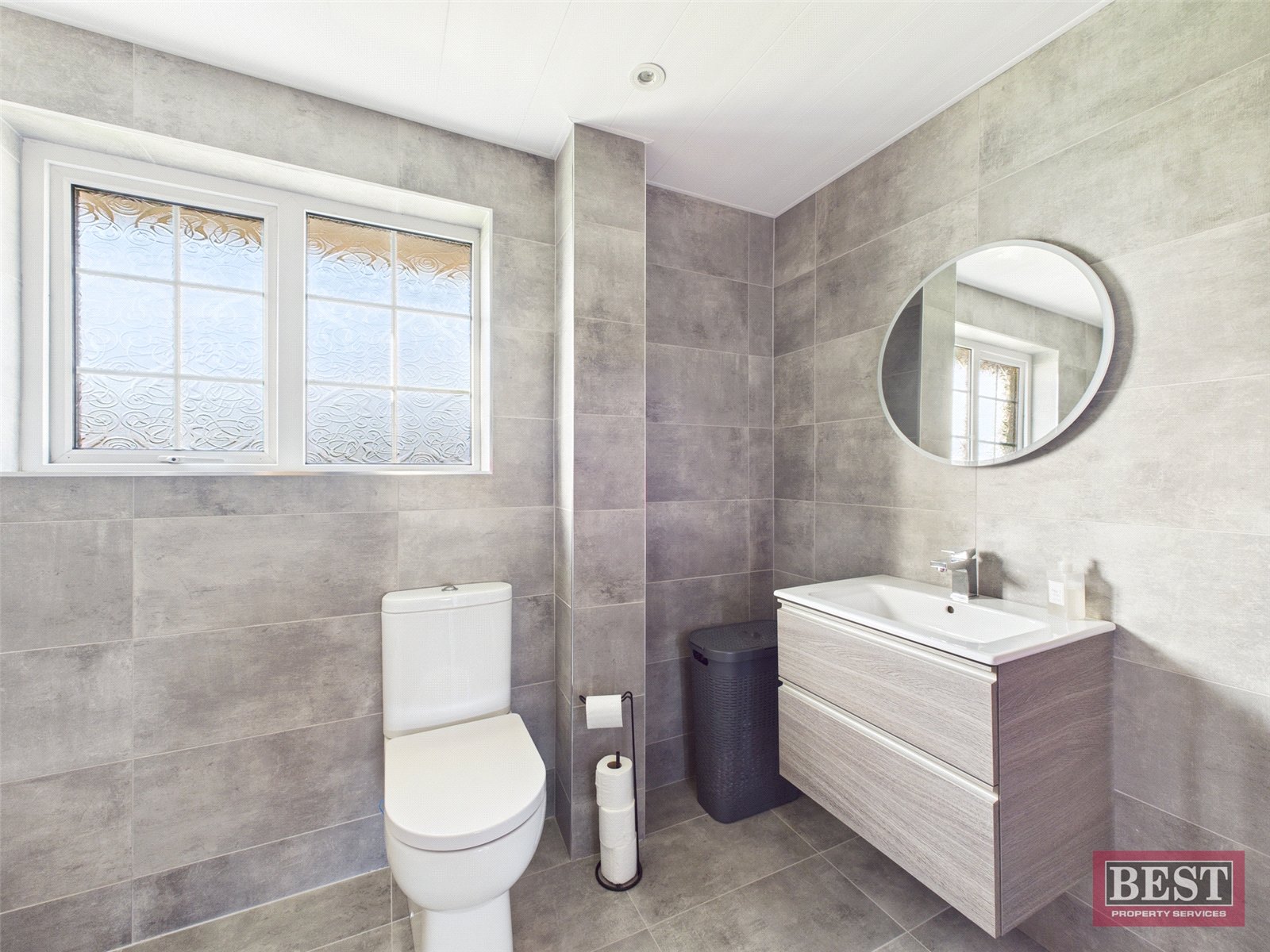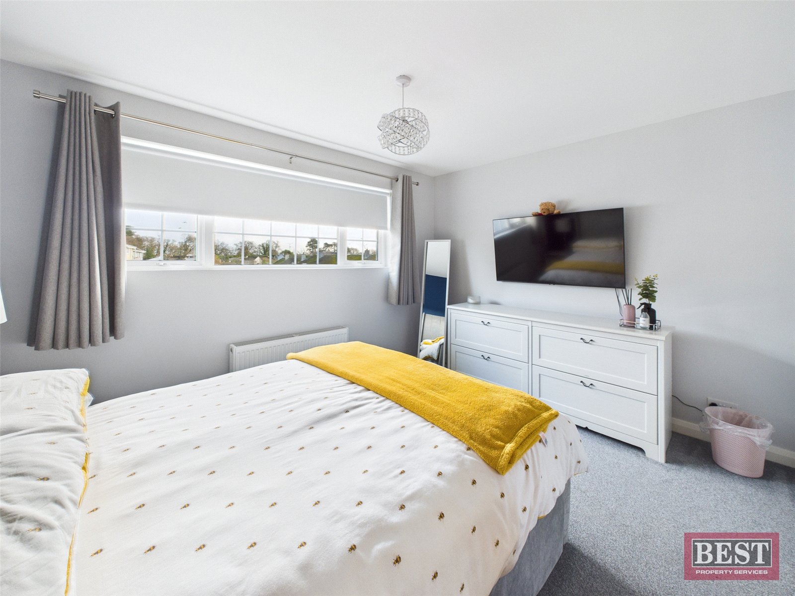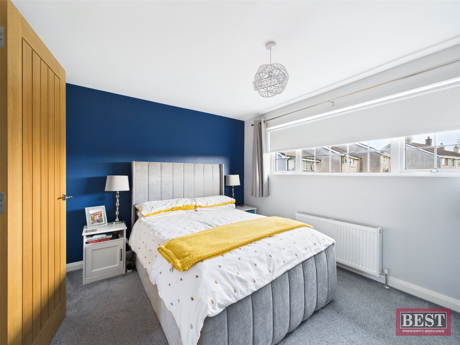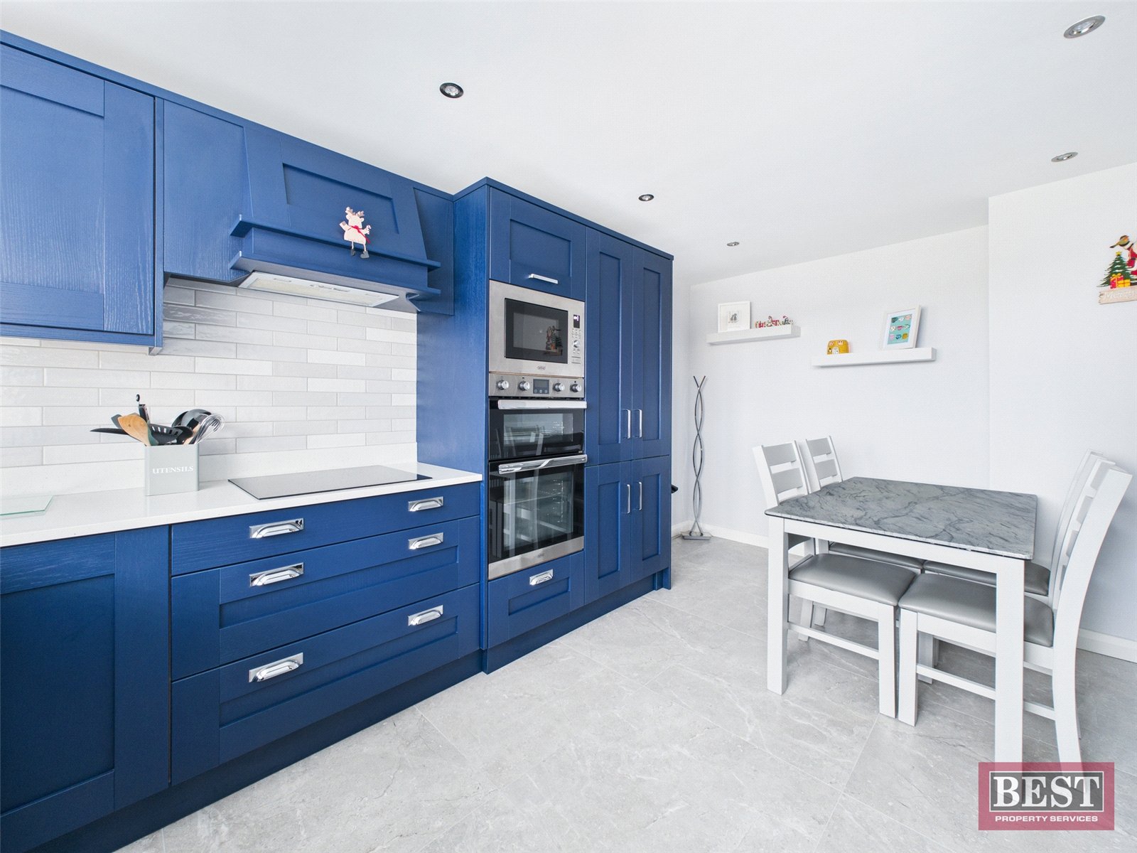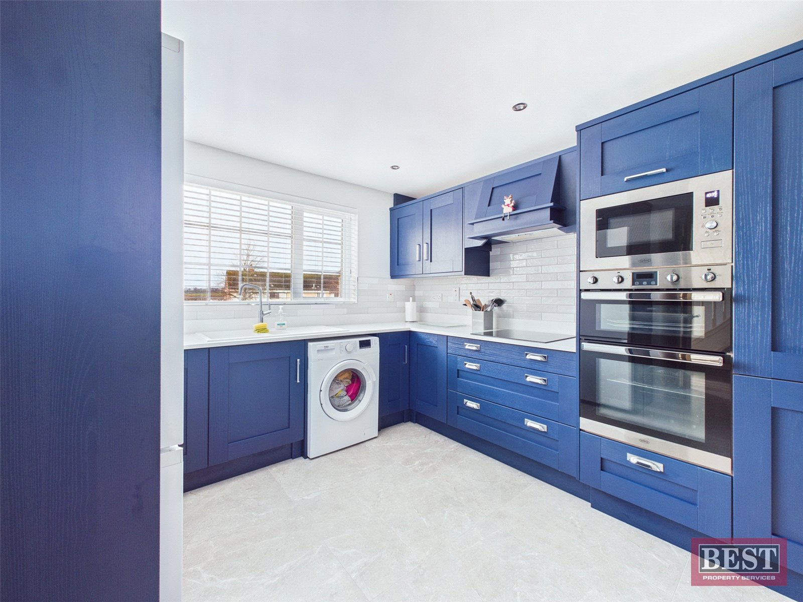 The kitchen, positioned at the front of the property, includes a modern range of upper and lower level units with integrated double oven and microwave, and space for a washing machine and fridge freezer. There is also ample room for a kitchen table, creating a comfortable dining area.