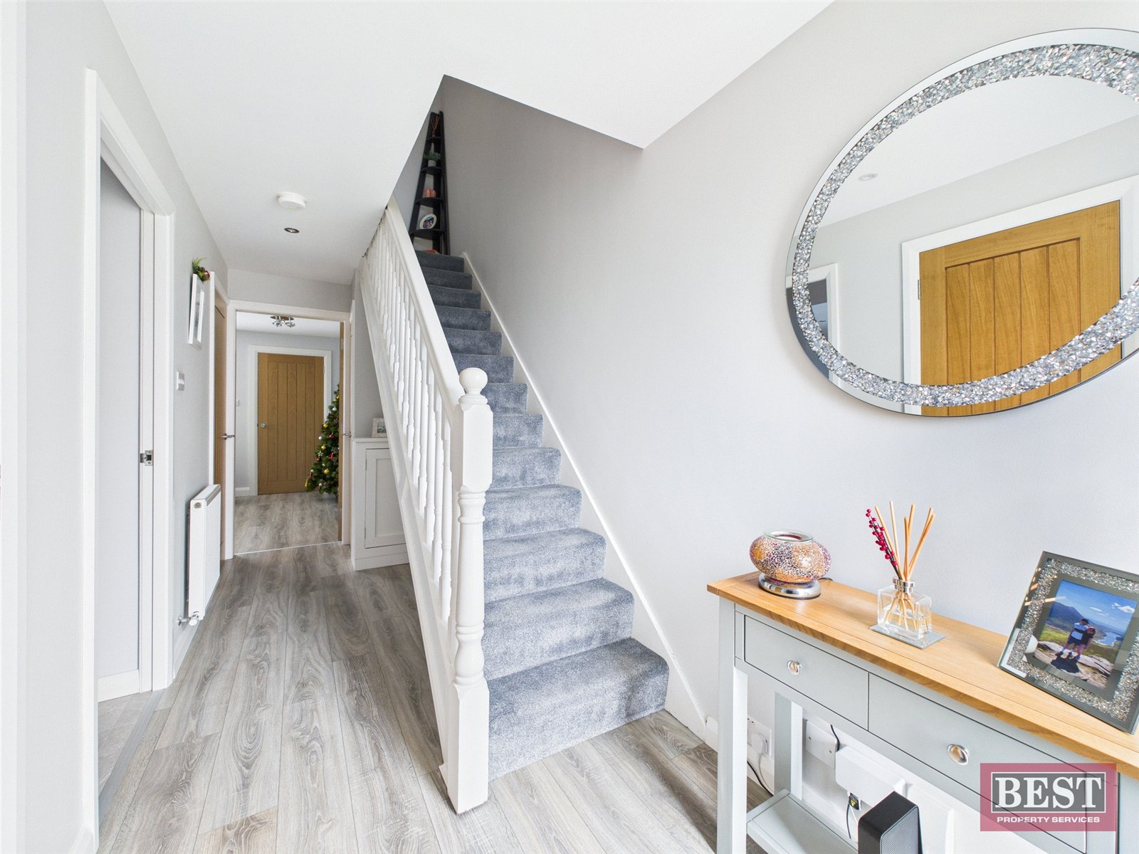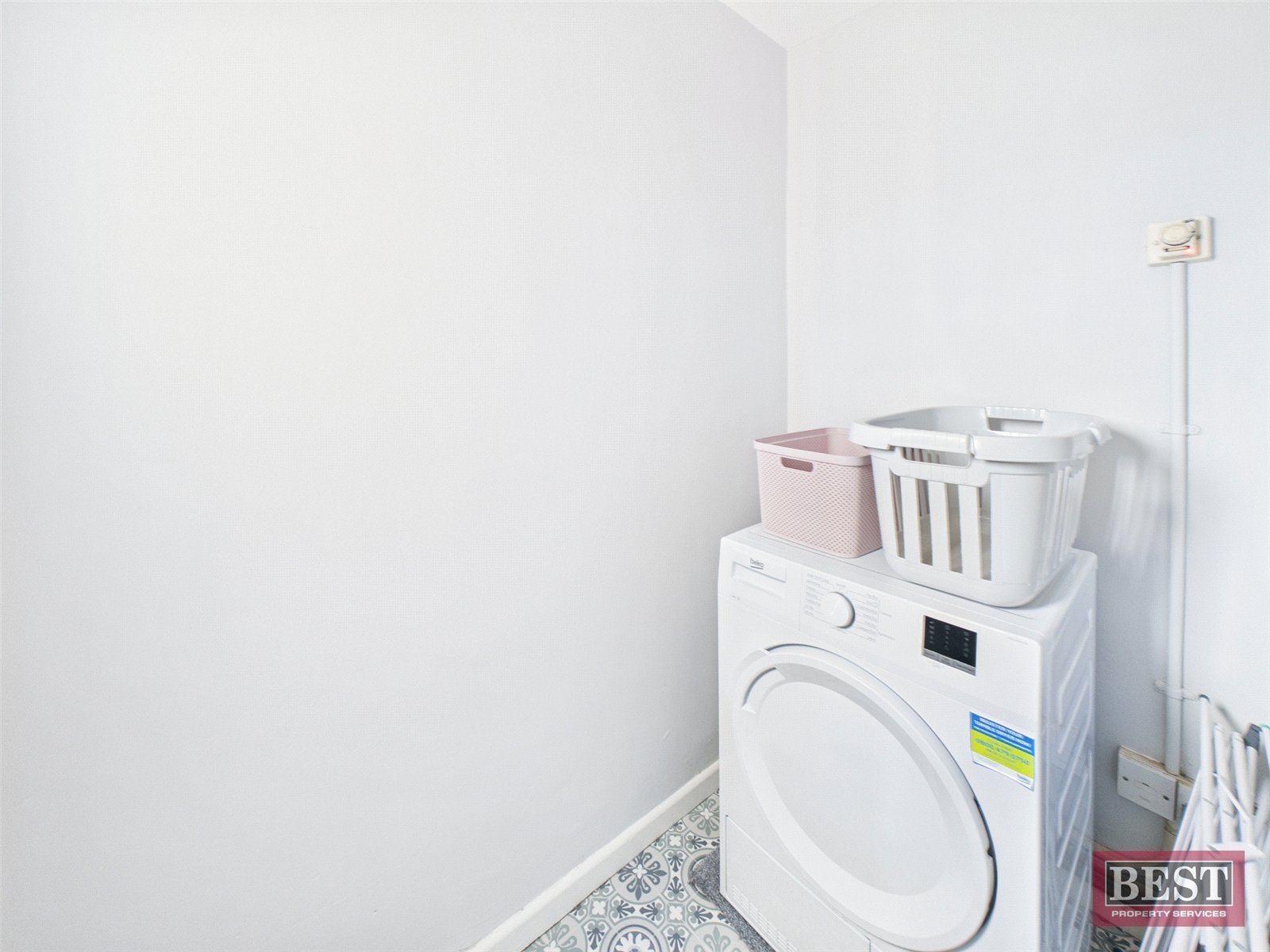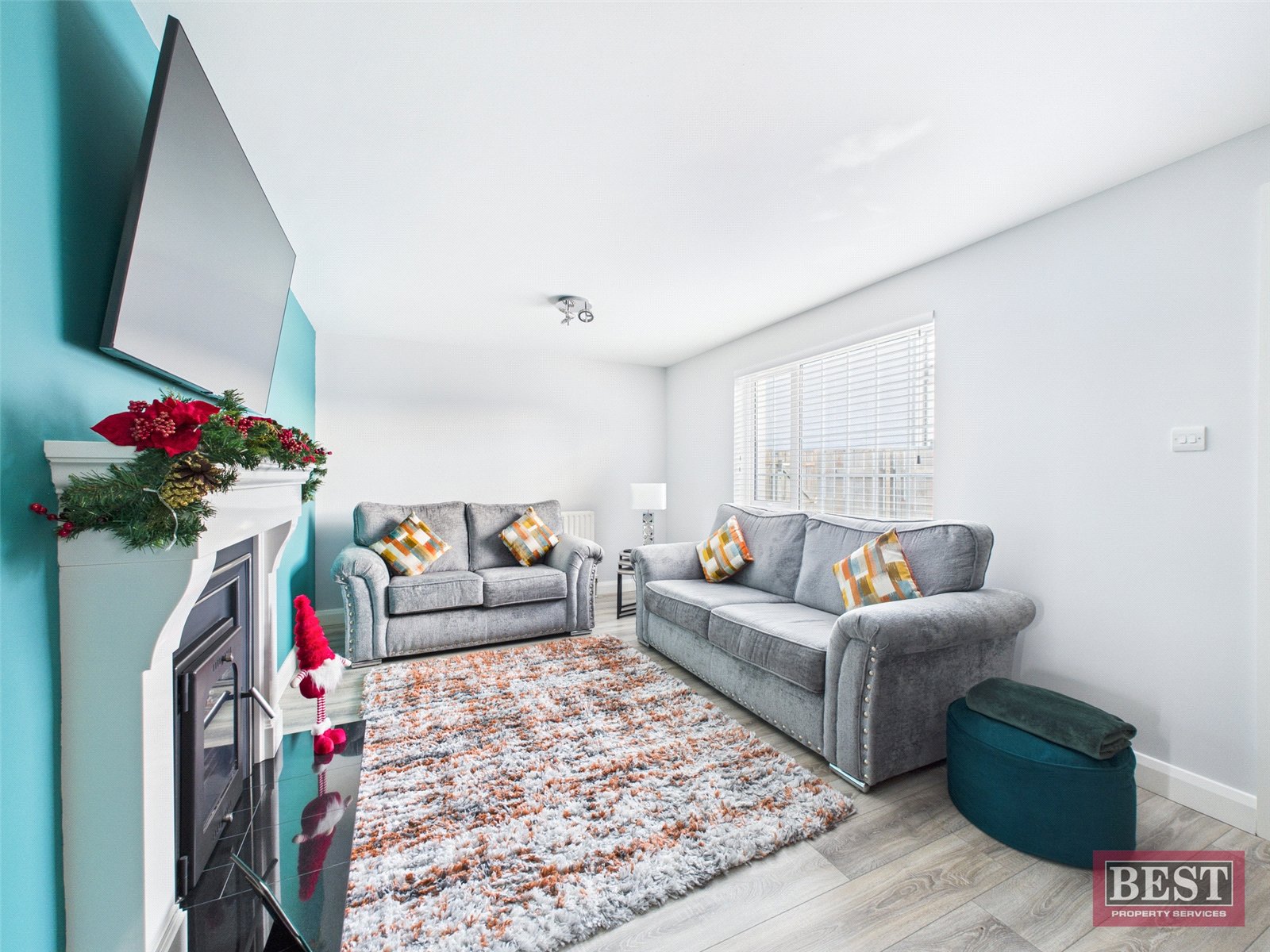 To the rear, the spacious living room features laminate flooring and a feature fireplace with stove, creating a warm focal point for the home. From here, a rear hallway provides access to the back garden and offers space for a tumble dryer.