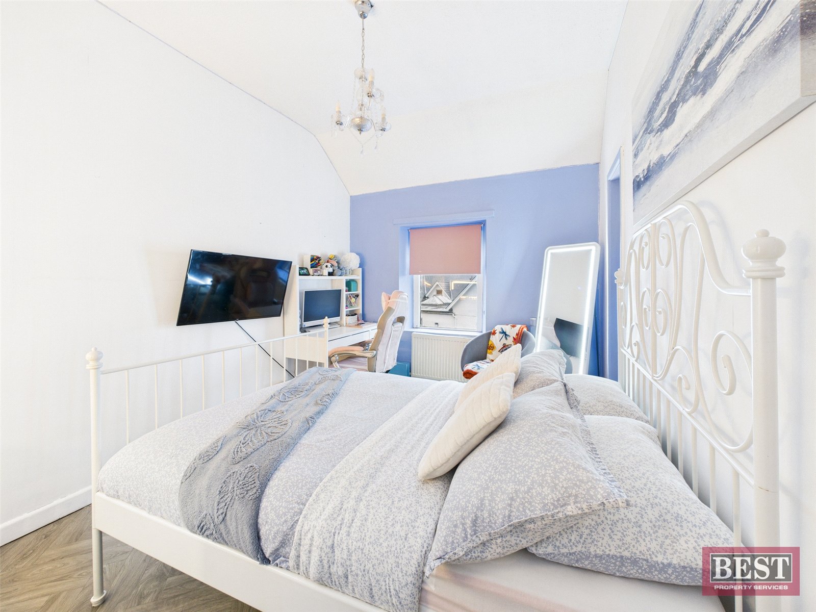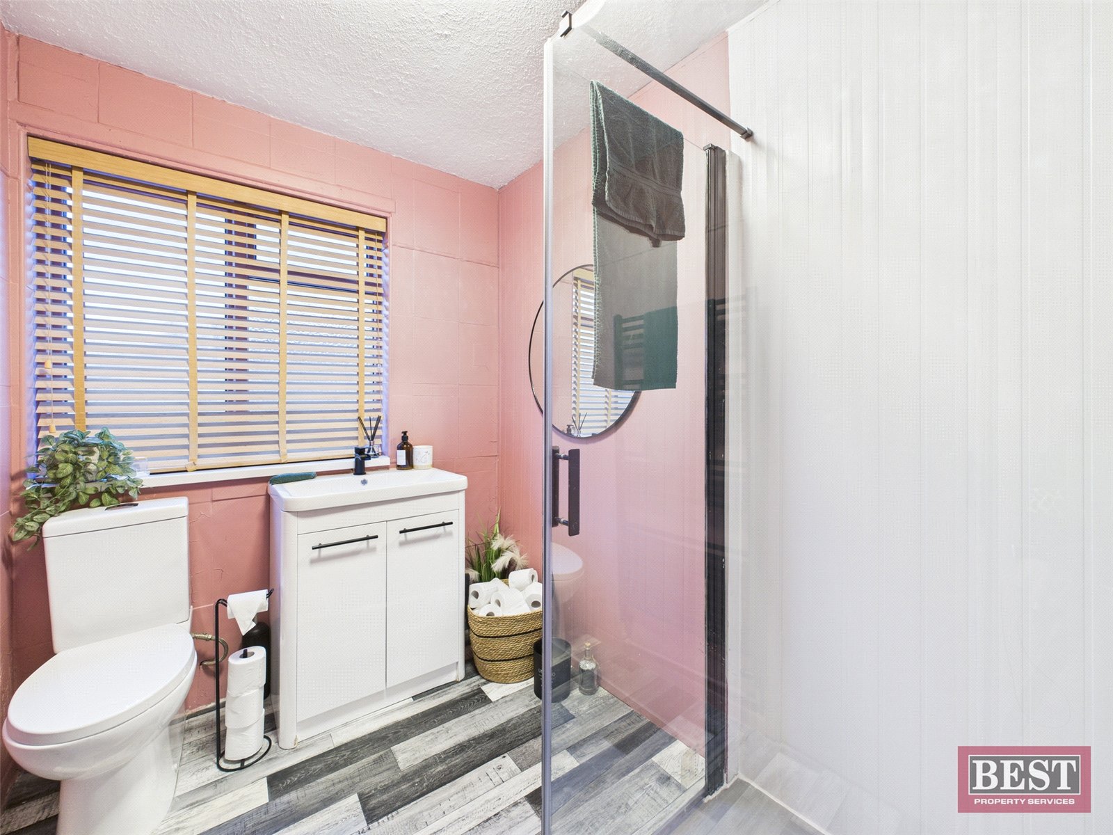 On the first floor, the landing features laminate flooring and provides access to the roof space. There are three well-proportioned bedrooms, all bright and airy: two front-facing bedrooms with vinyl and laminate flooring respectively, and a rear-facing bedroom finished with vinyl flooring. The accommodation is completed by a rear-facing shower room, fitted with a white suite including a separate shower cubicle with PVC panelling, vinyl flooring, and a heated towel rail.