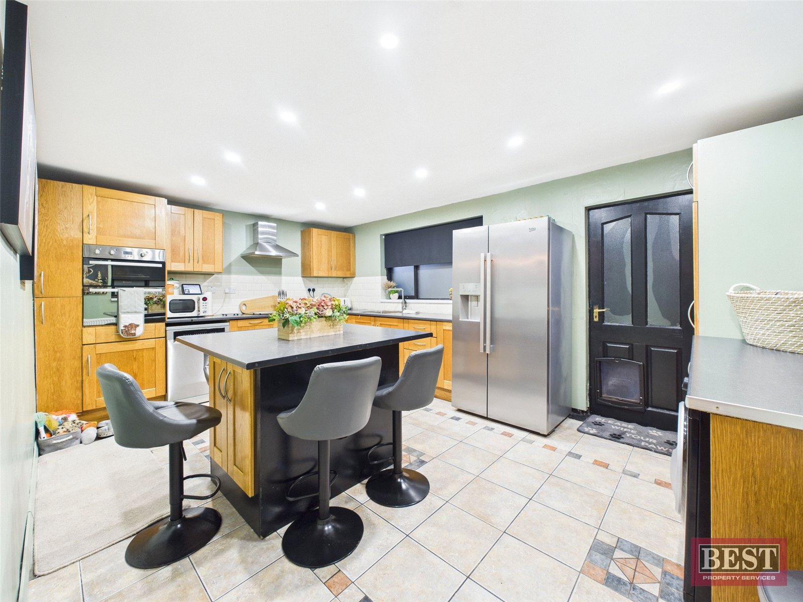 To the rear is a generous kitchen/dining area, fitted with a range of upper and lower level units. The room is finished with tiled flooring and is plumbed for both a washing machine and tumble dryer, with space for a cooker and fridge freezer - ideal for modern family living.