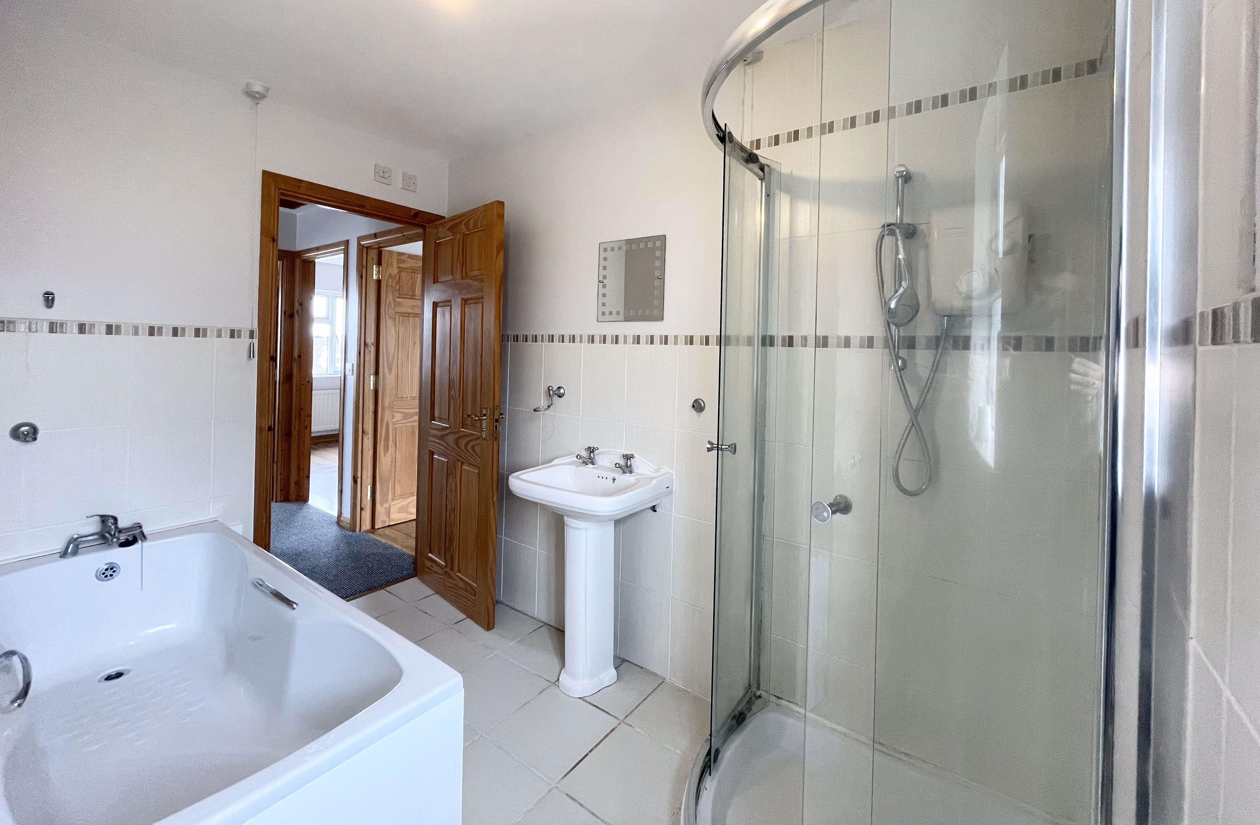 Tiled flooring, half height tiling, electric shower, bath, pedistool basin, toilet