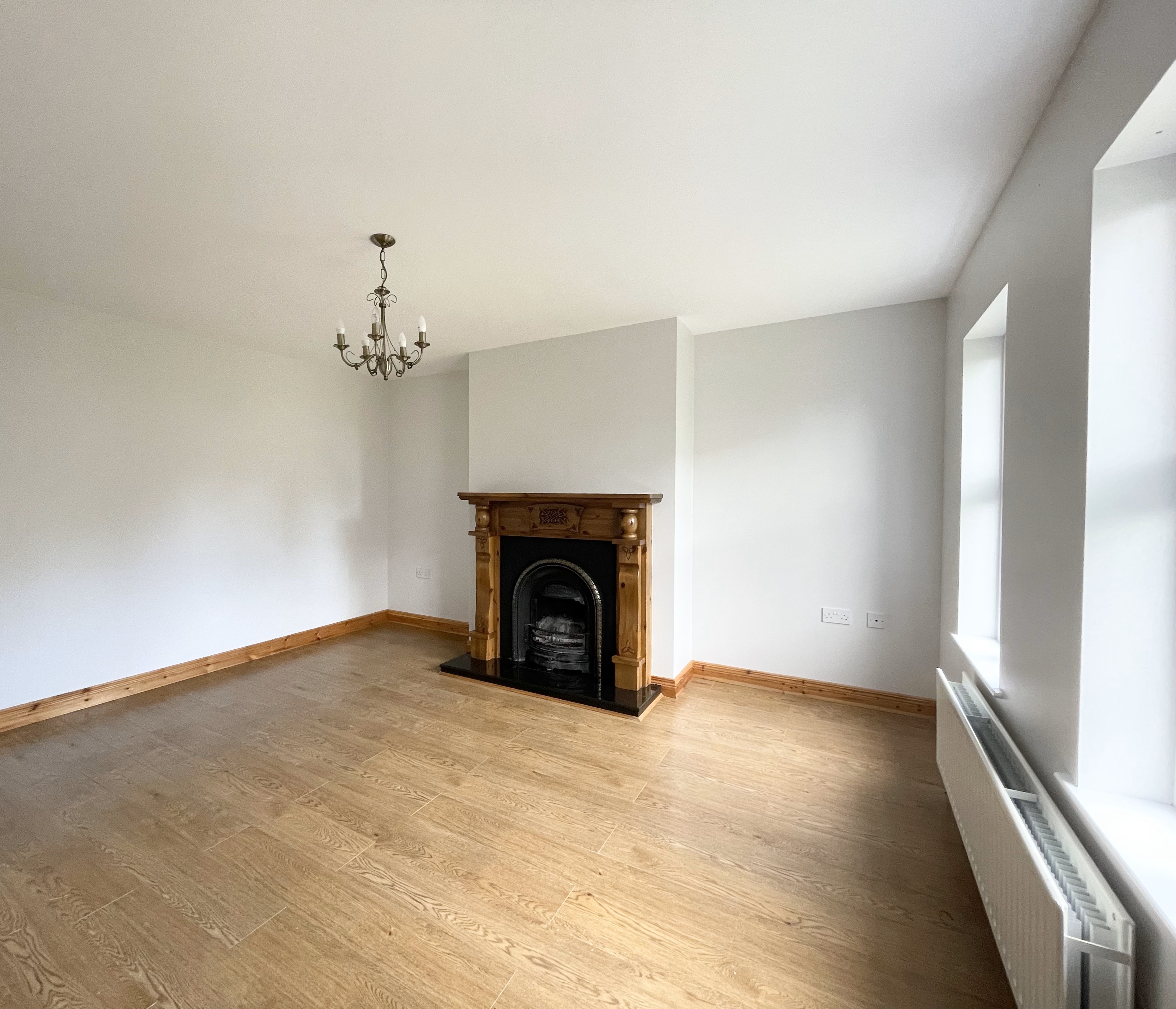 Laminate flooring, cast iron open fireplace with marble hearth and wooden surround